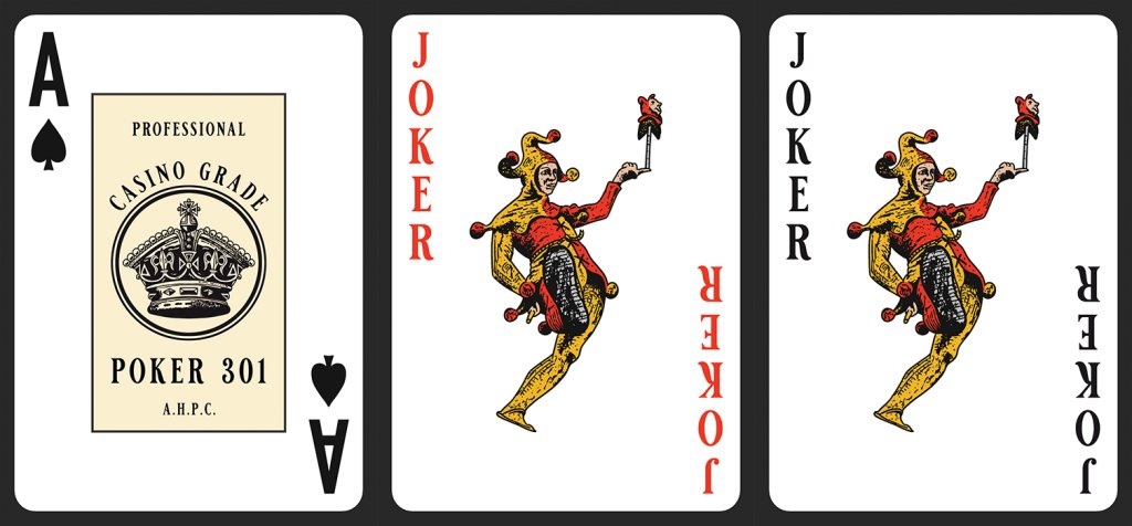 The AoS I wanted a central bold piece of iconography that ties in with a classic, refined theme, and has historic links to playing cards. Something that could sit in a clean, uncluttered design. I chose a crown. The Jokers I just went for a classic Jester type character in traditional colours. Not life-changing but I think it hits about where it's supposed to!