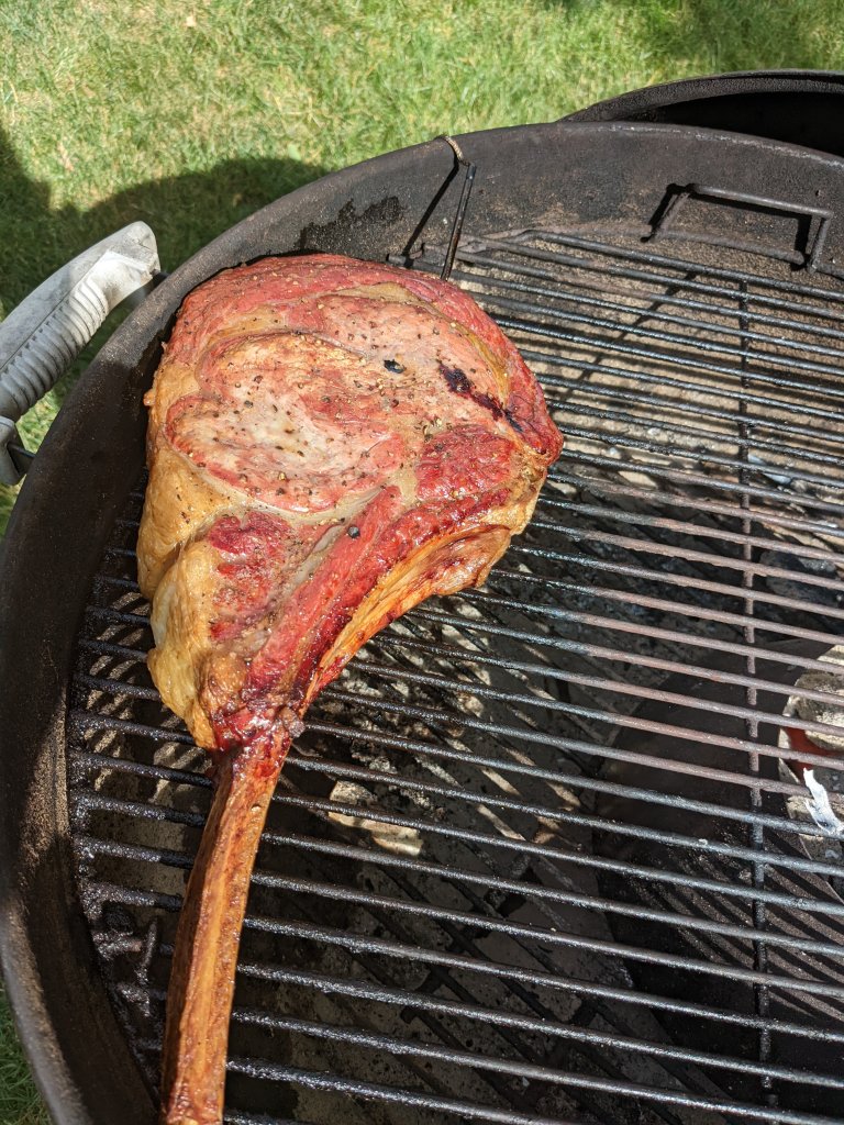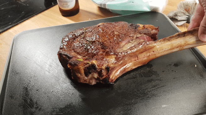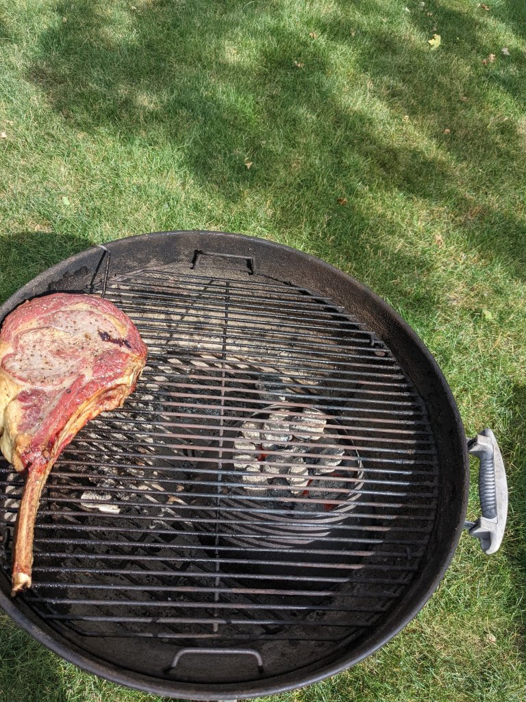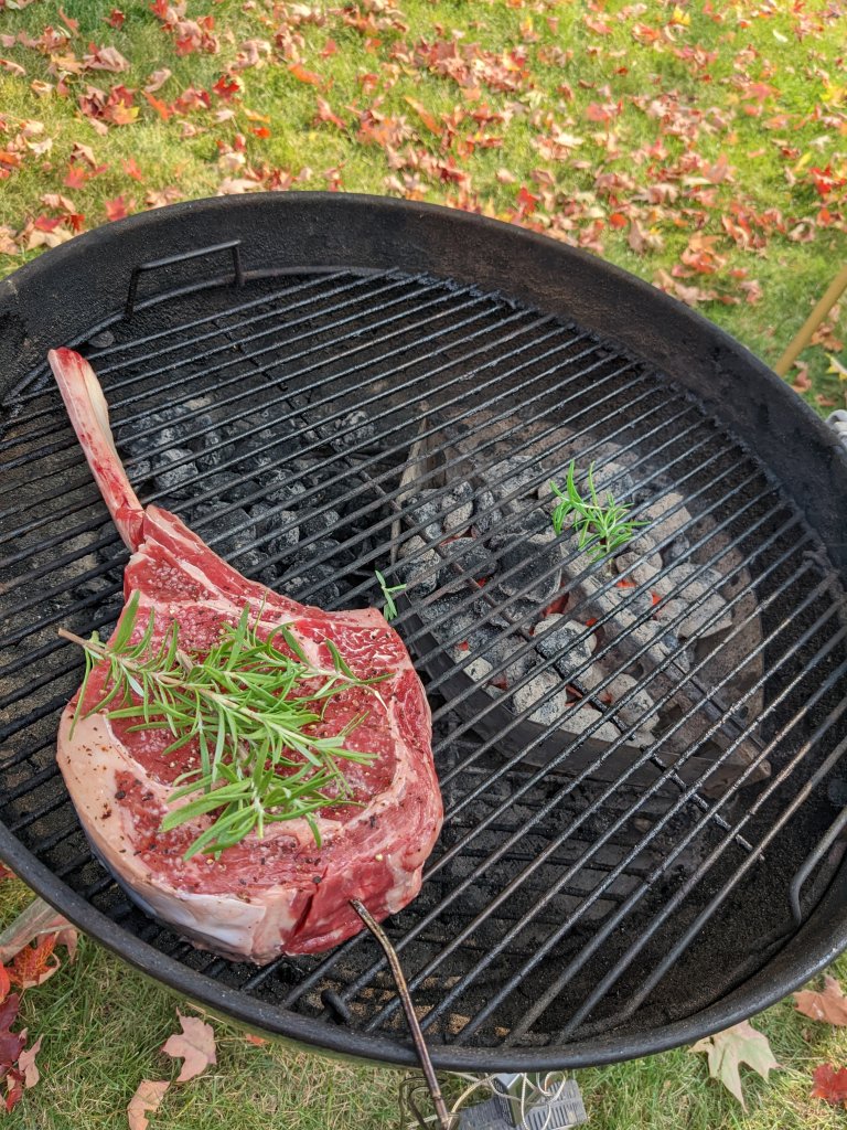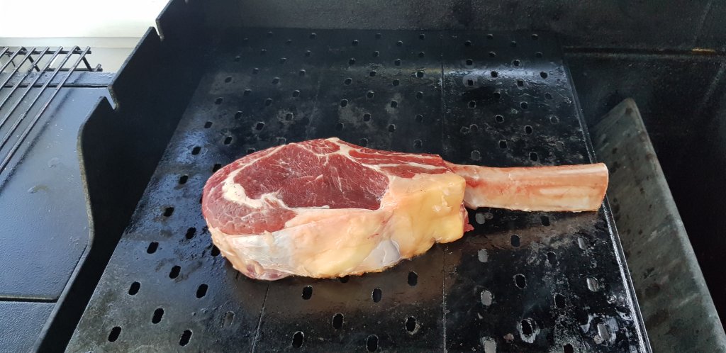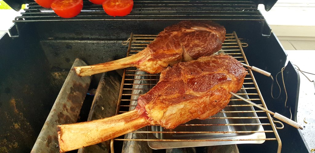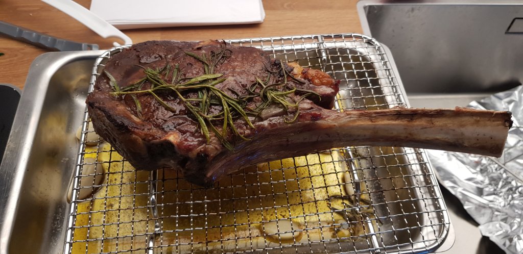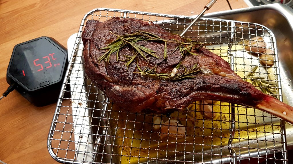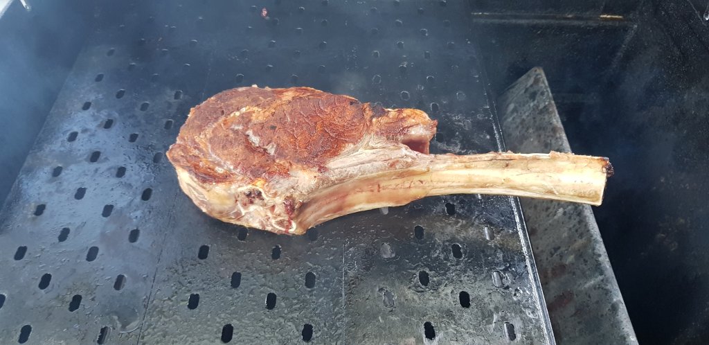 Then indirect grilling at about 110°C having a container below it with butter, fresh rosemary and garlic, from which I basted the tomahawk a few times until it reached 51°C.