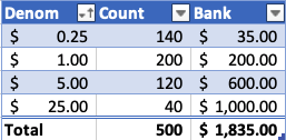 About the breakdown, I think traditionally you're right, but I'm not sure my game will play that big. We usually play .10/.20, but I didn't want to worry about two fracs, so I'm thinking we'll play .25/.25. Do you think we'd need that many fives? I'd thought about $50 starting stacks of 20/20/5.