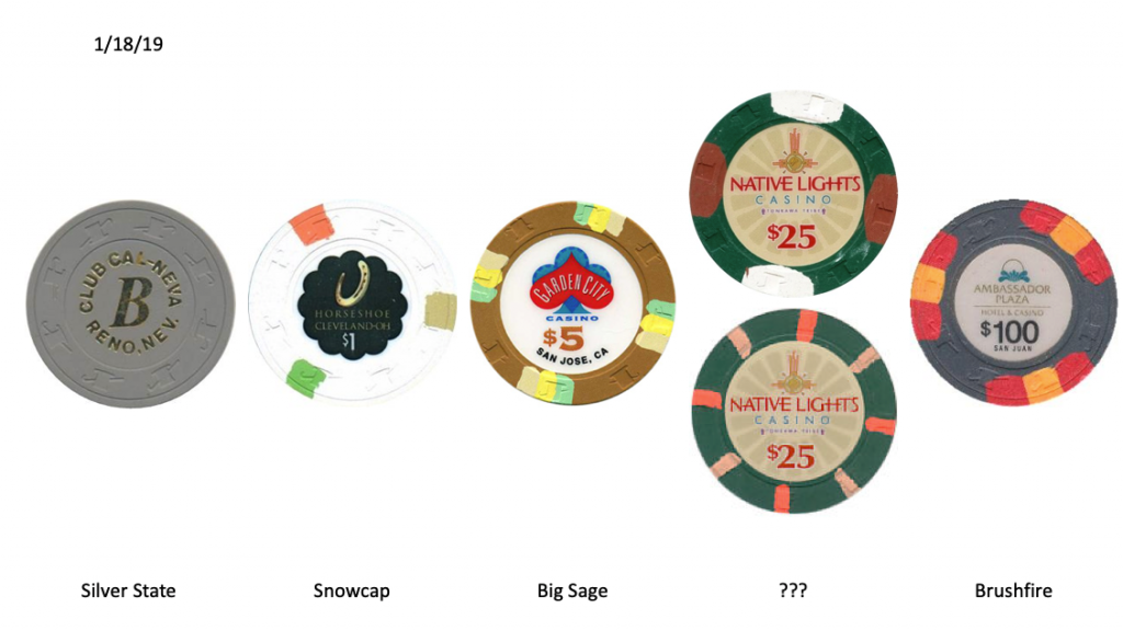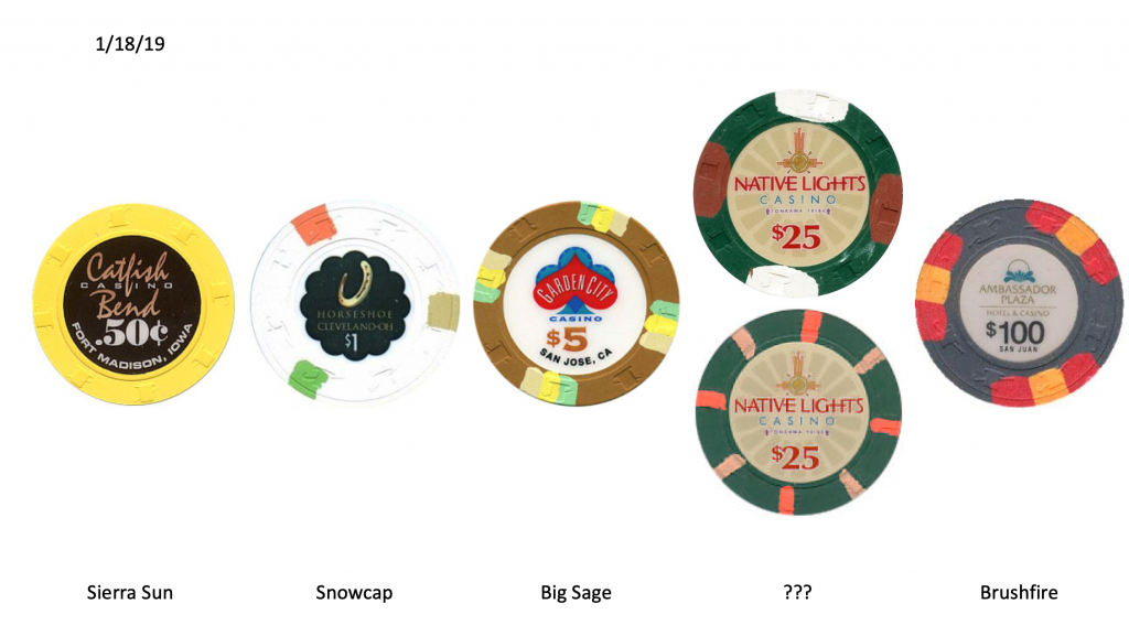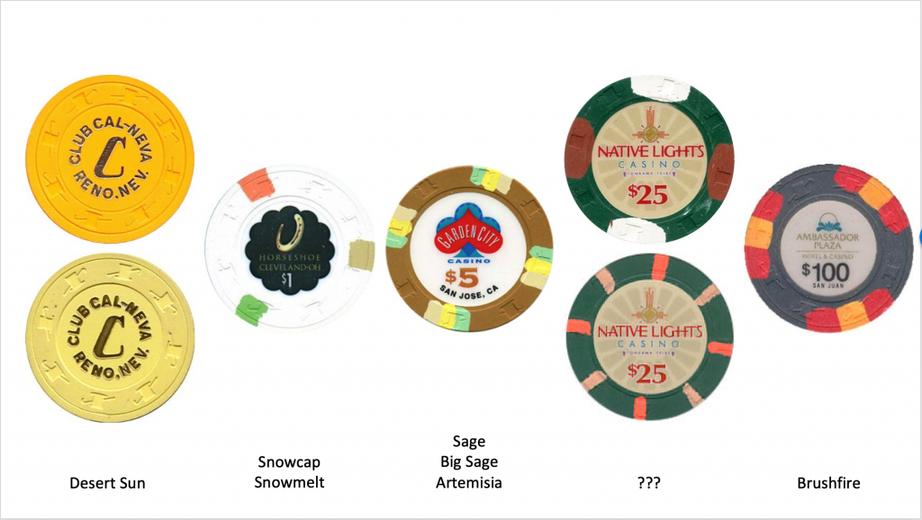 I got the idea after seeing @fish72s's post selling a really cool set of RHCs which sort of revolved around the brown spots on the Chips $25. Included in that set were some Garden City $5s, which I fell in love with. I liked the idea of using non-traditional colors to make my set stand out. (I've since learned that lots of people like the GC $5. That bothered me a bit, but of course they do! It's a beautiful chip.) I love the light brown base, but to me, what really made the GC $5s stand out was the light green edge spot. Those colors look just like our state flower, the sagebrush I've lived near all my life.