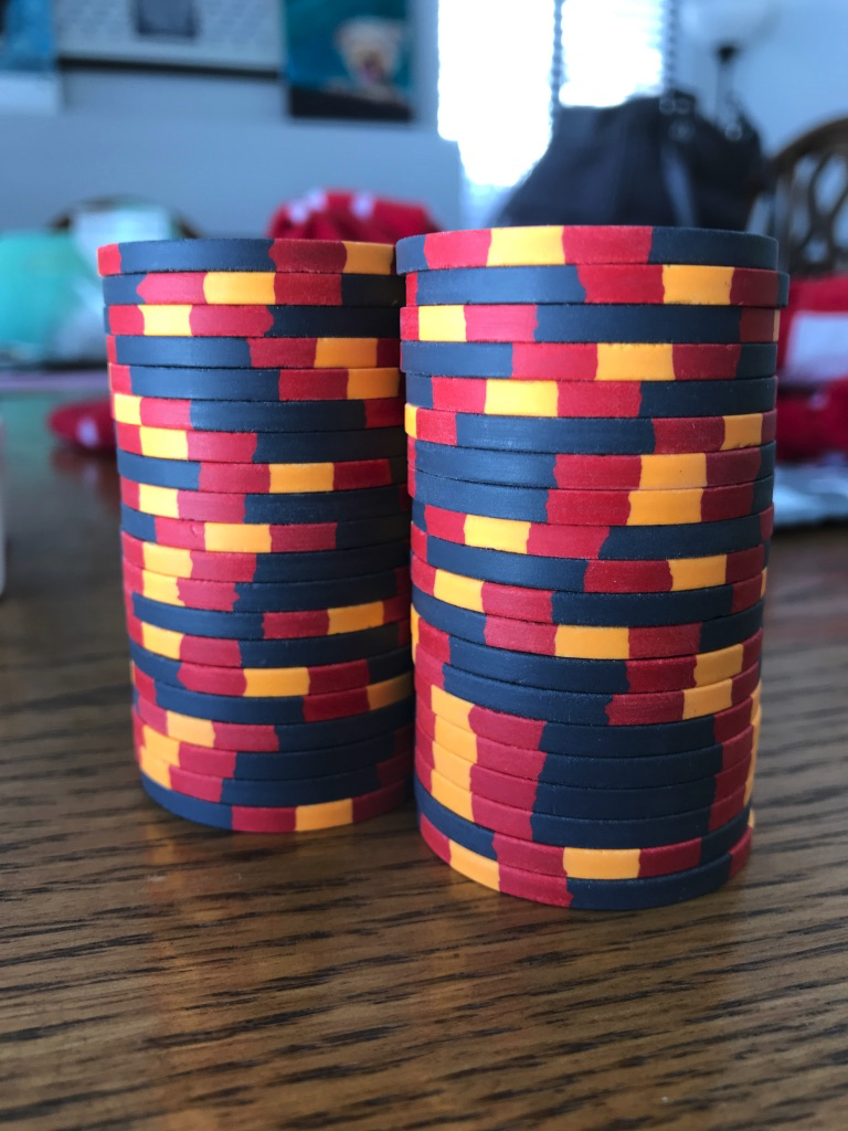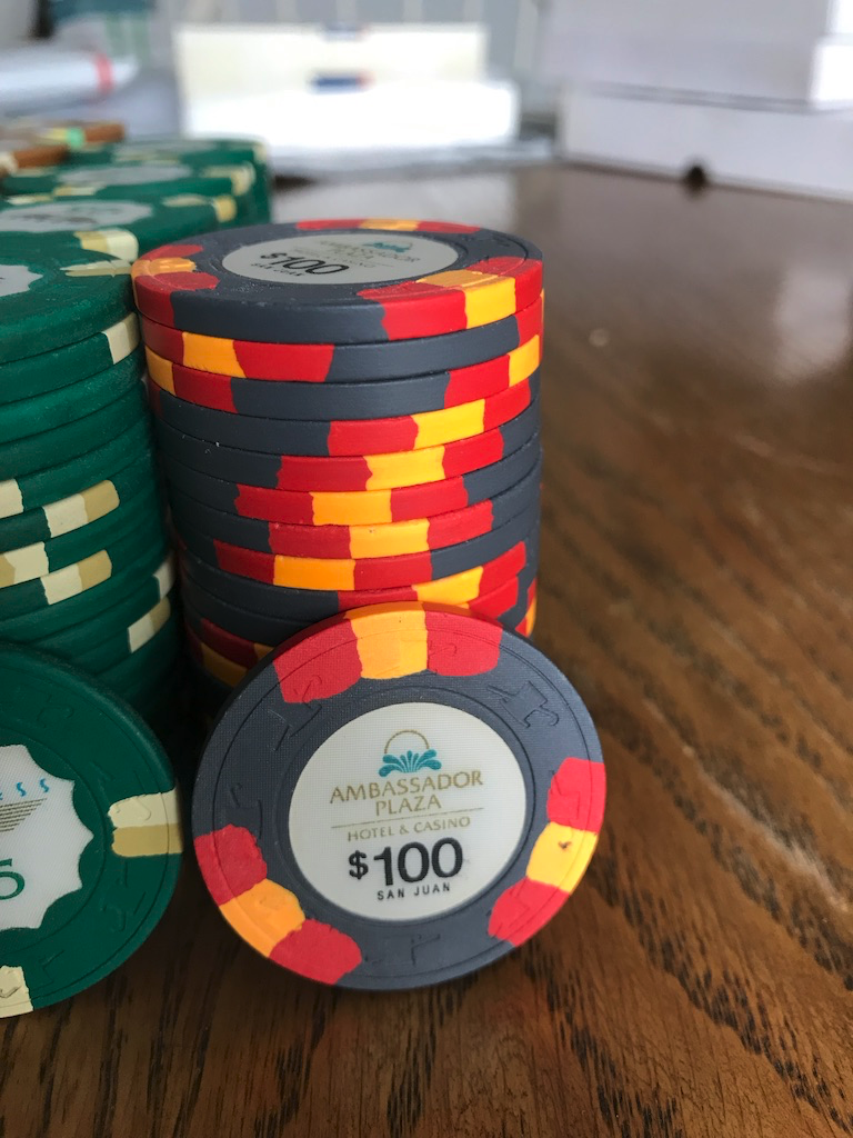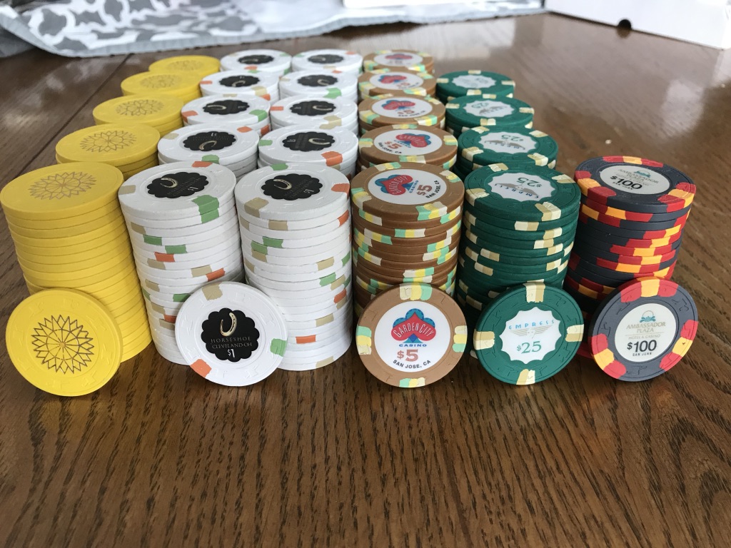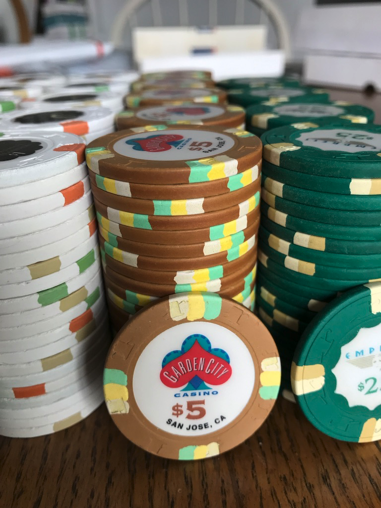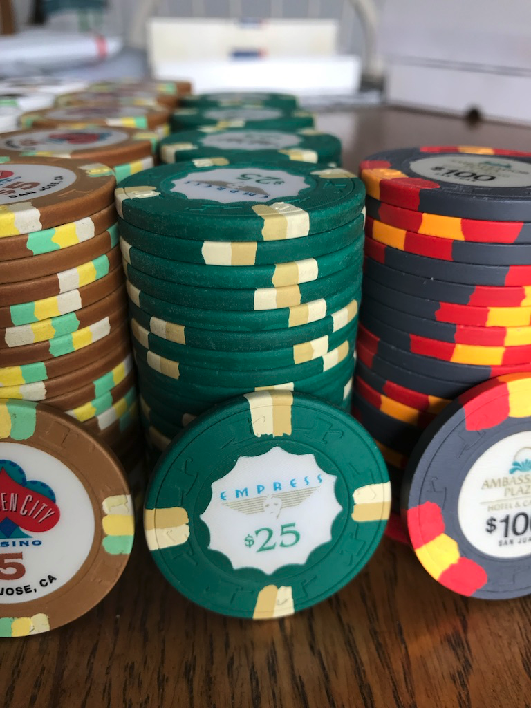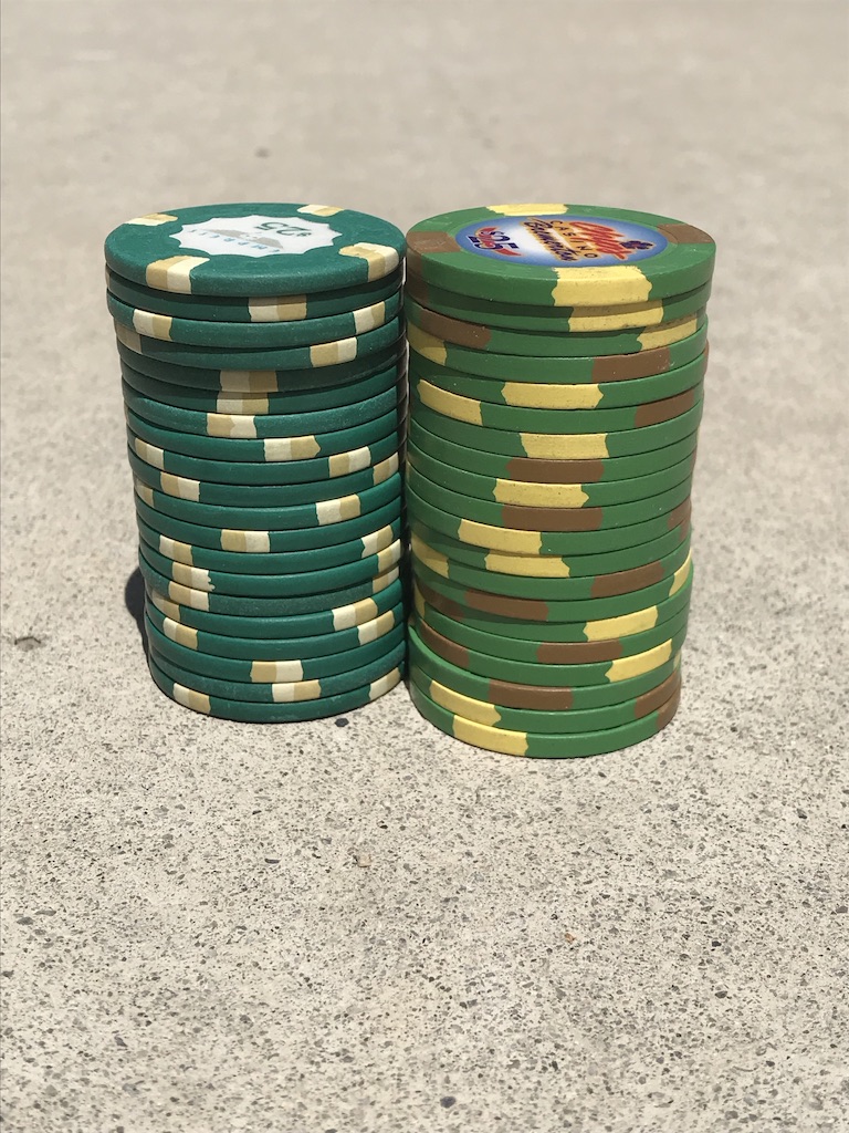 EDIT: Excuse the stand-in $25s in the first image. They're GC $2s. Just the only dark green chips I own.