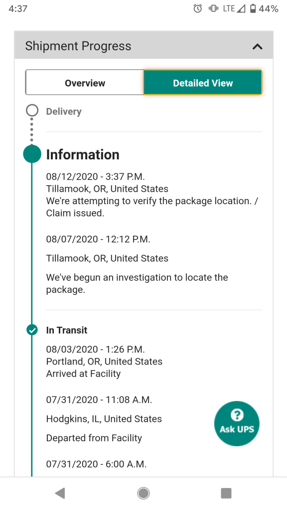 This is what a lost package looks like, and they have been fighting me on my claim ever since. Moral of the story, UPS sucks.