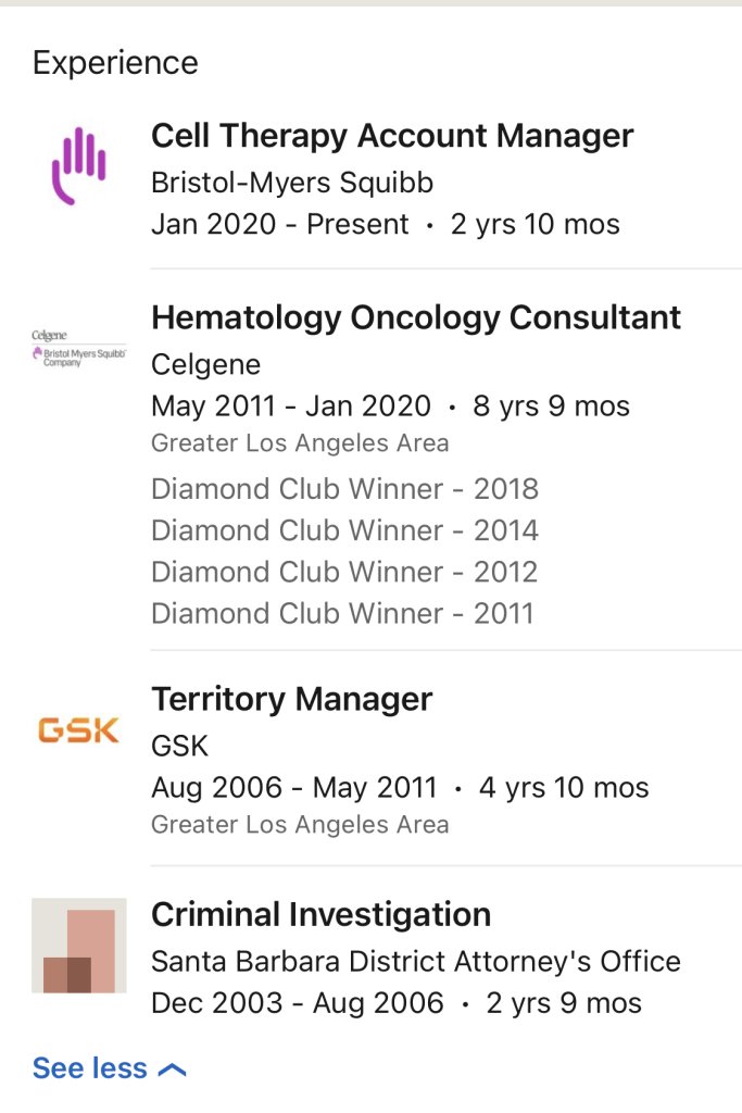 From my recollection of what she said on Joeys podcast, she claimed to have been in a "Director" position, which I don't see, although all of her positions do have 6-figure salaries (although she's working in Los Angeles so the cost of living is significantly higher, reducing the impact of those incomes).