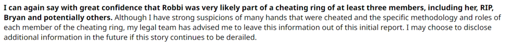 Almost looks like a type of fishing expedition to me; I bet they would welcome a lawsuit if they are not only 100% sure she cheated, but if they also have more proof that hasn't been disclosed yet. Couldn't imagine what Discovery would uncover with such a shady group of people. Others have said that direct evidence of cheating hasn't yet been provided, but that doesn't mean it doesn't exist. A forum post is just that. This almost seems like a calculated move to justify his actions in the court of public opinion and get Robbi, RIP, etc. to further jam their feet into their mouth through more statements/actions.