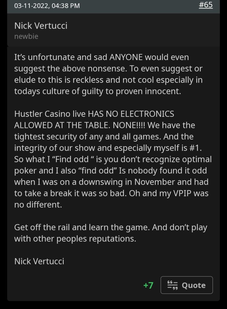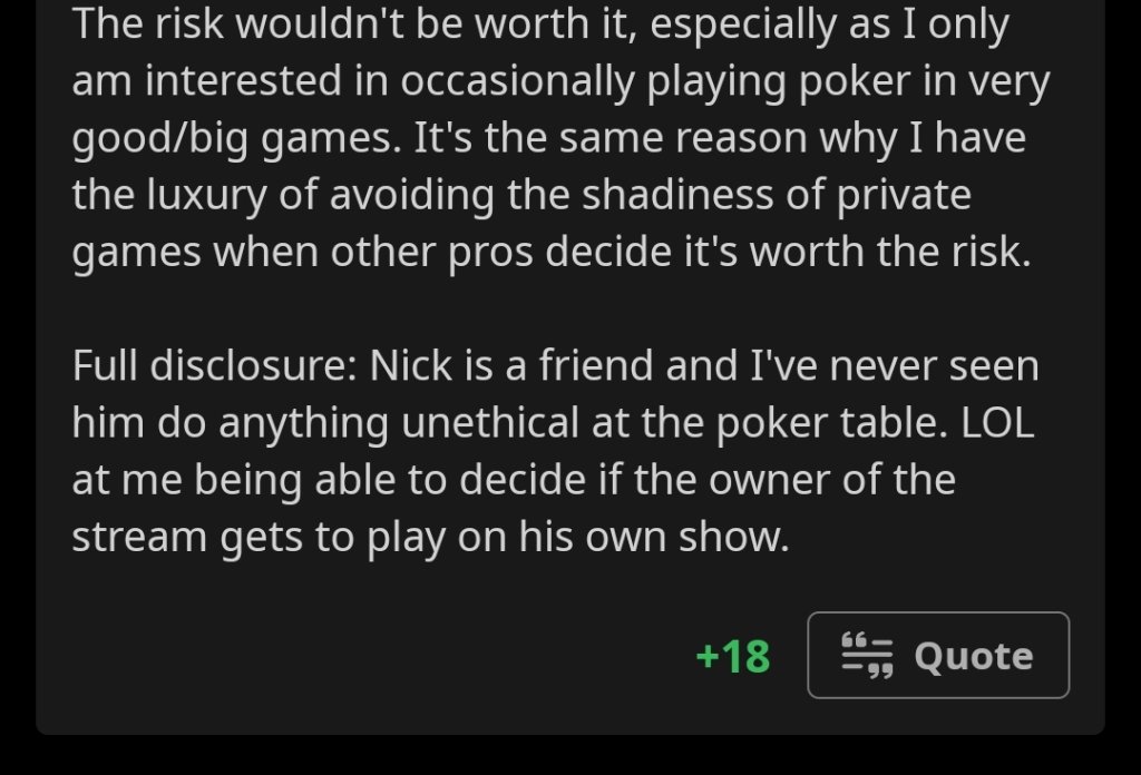 Christ, that sounds even worse. So that means that he was only in charge of a few employees for ONE livestream specific game - how does he manage to fuck that up this hard???Nick doesn't own or run Hustler Casino