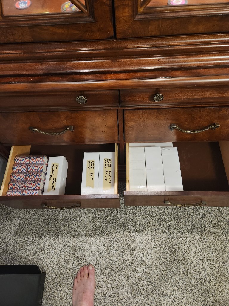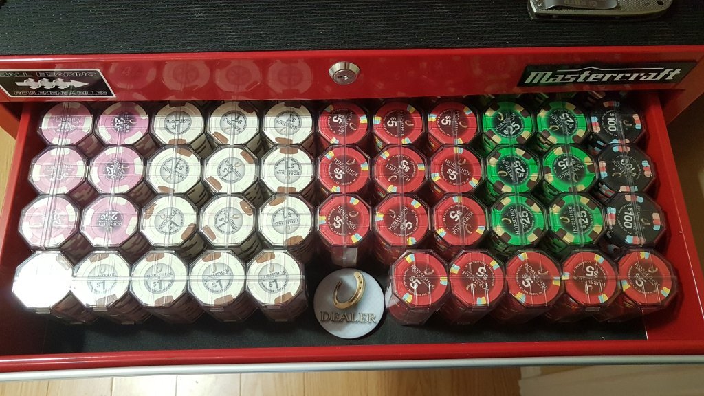 I could fit 6 standard racks across each drawer, vertical with the stacking racks I can fit 11 across. Some drawers are not tall enough for stacked standard racks (36mm chips can be stacked, not 39mm though too tall). Thus i have 1 drawers with 1100 HSI's, 1100 36mm cinci, 1600 36mm majestic star, and 2 large drawers with the balance of HSIs and 47mm accessory chips. Top drawers holding plaques, 600 36mm chips in standard trays and dealer buttons/cash box in the top lid section. Further drawers holding cards and a few larger dealer buttons.
