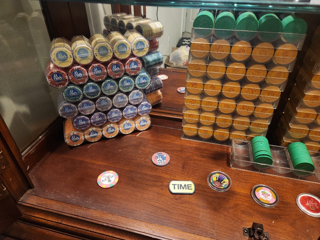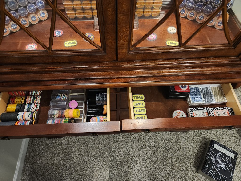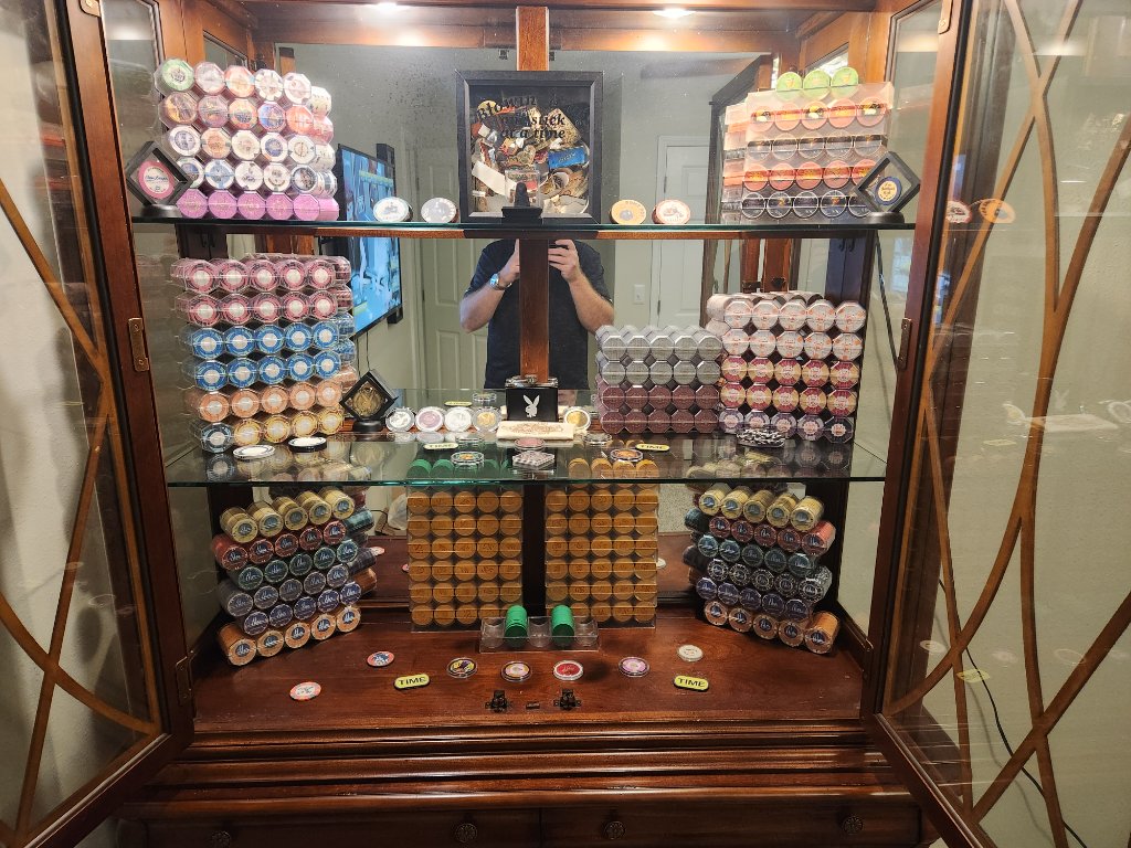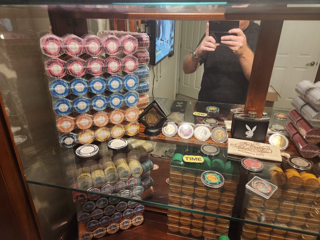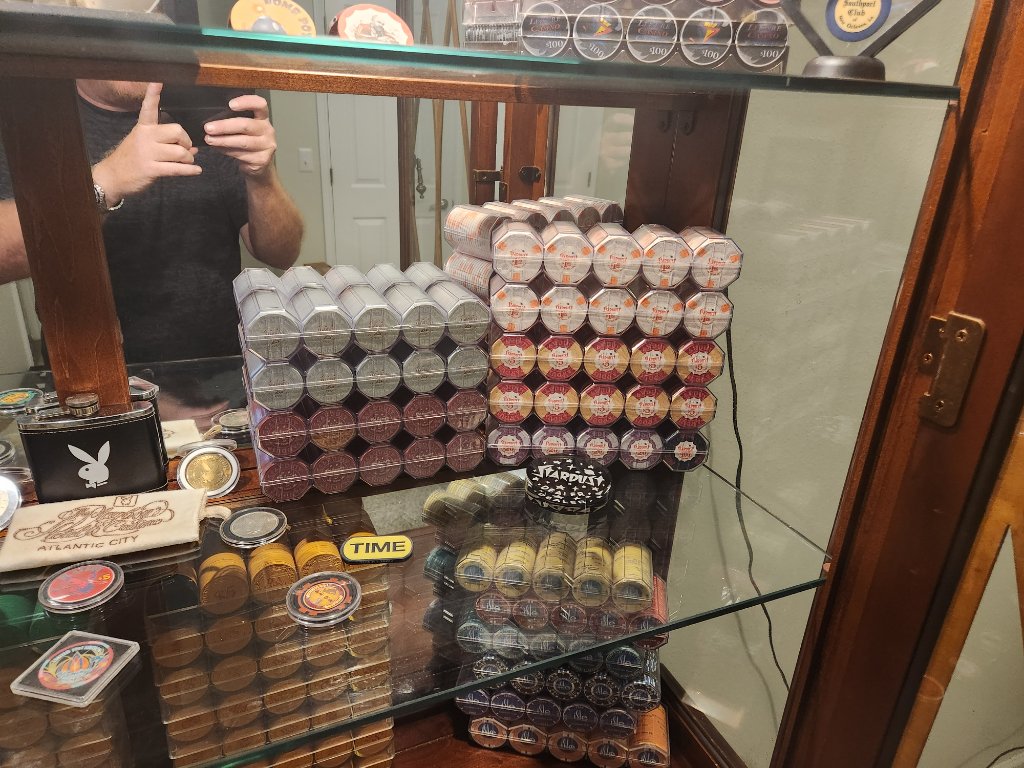 *if I had less chips it would fit everything. It does hold my largest cash set, two tourney sets + plaques, cards, and accessories including buttons etc... over 11k chips etc...great for home games ;)