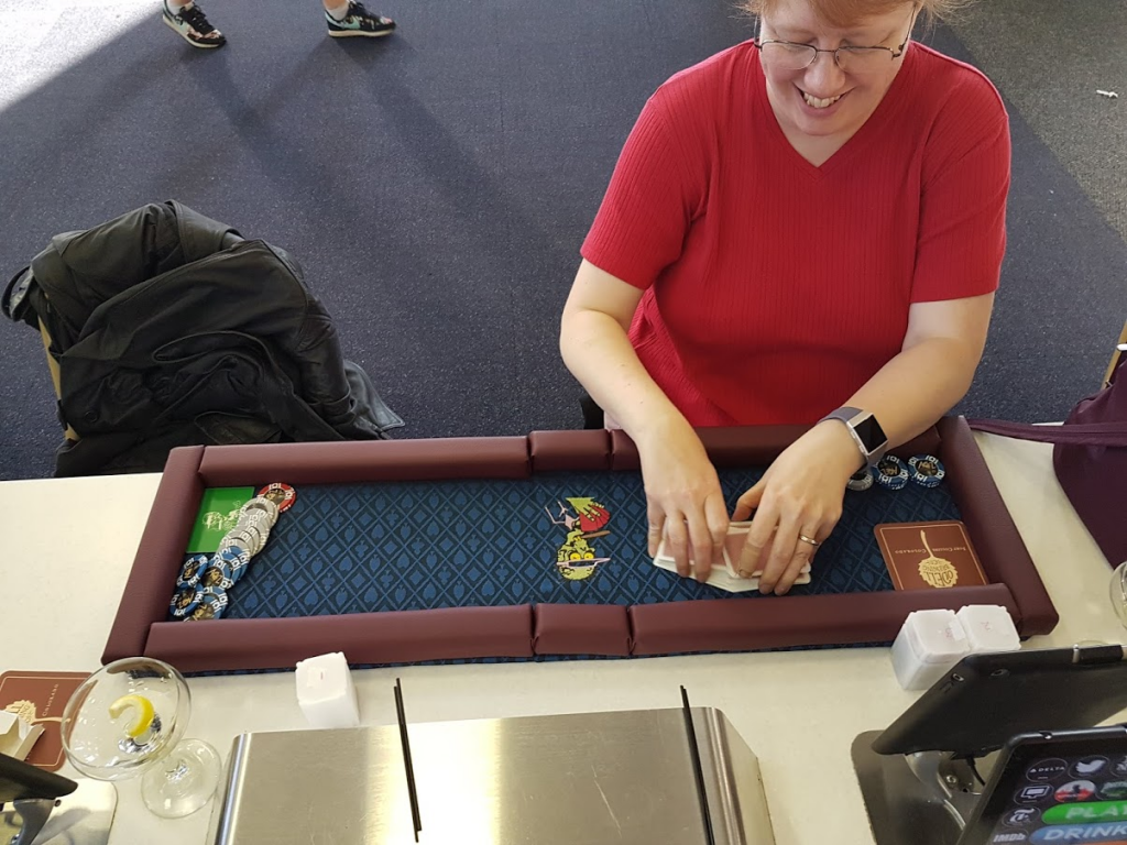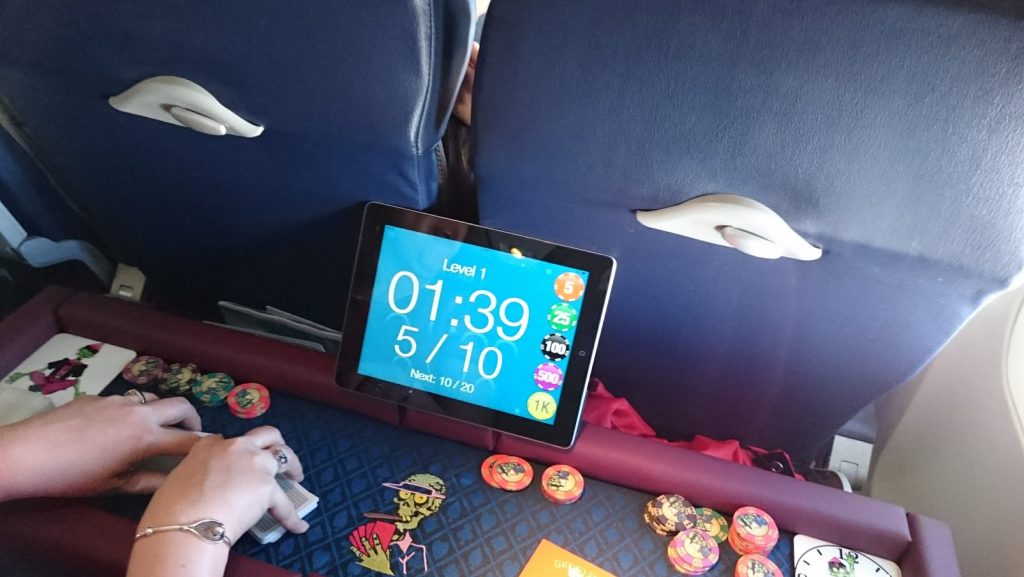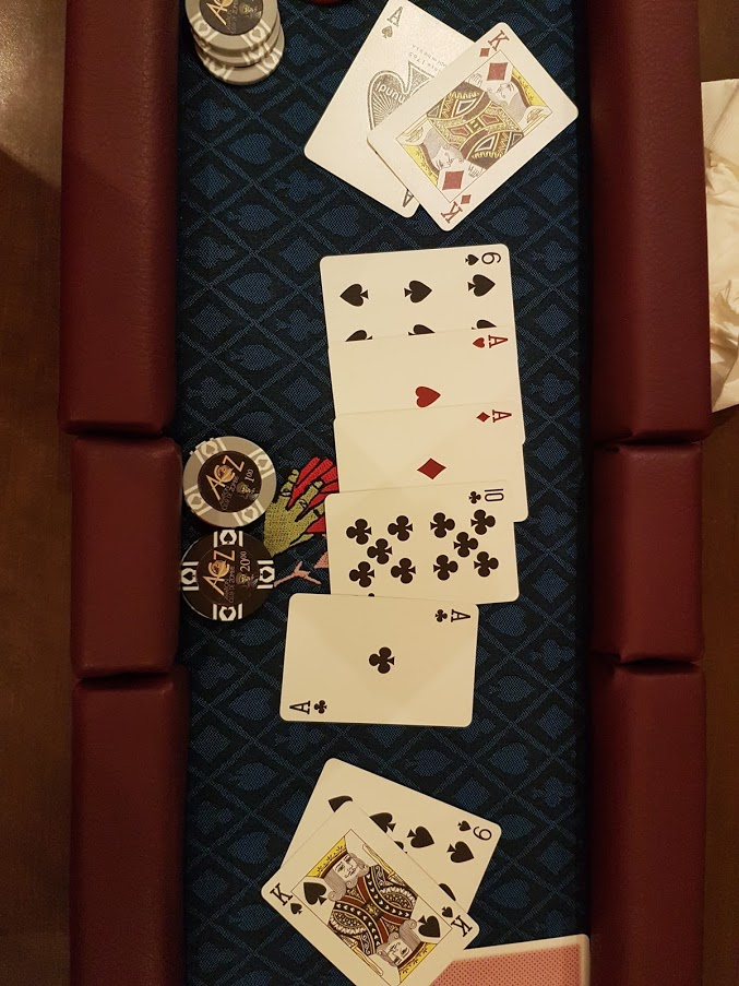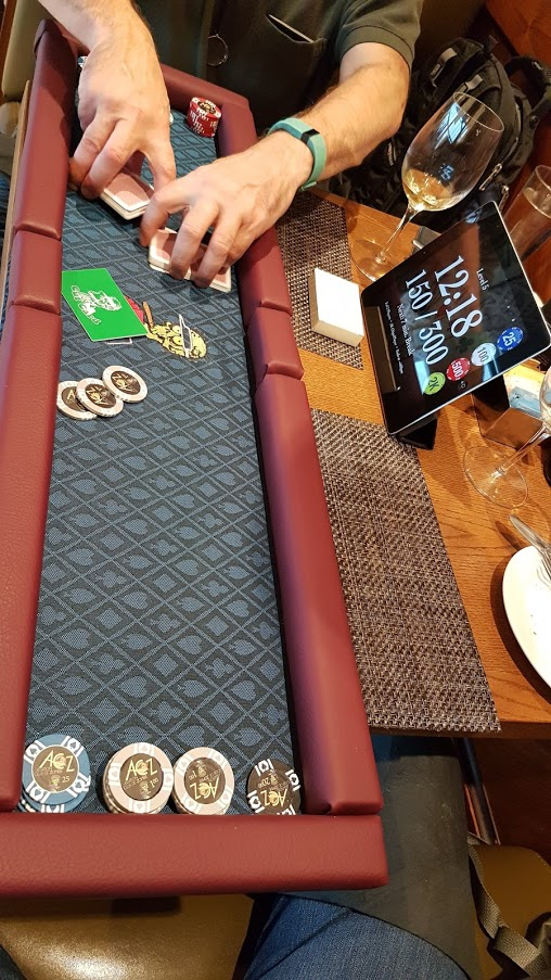 Board gets a little crowded with poker-size cards. I may pack up bridge size instead, but I am really fond of the Bicycle Prestige card boxes. If we have to pack up in a hurry (like the person in the window set has to pee, or the plane is about to crash) the Prestige box allows packing the cards very quickly.
