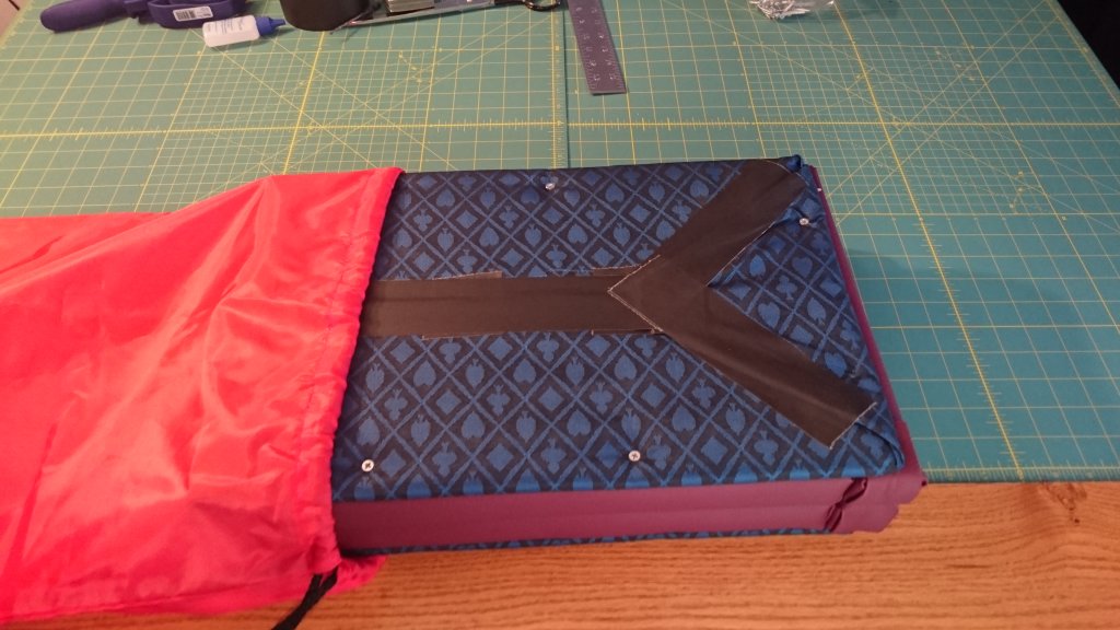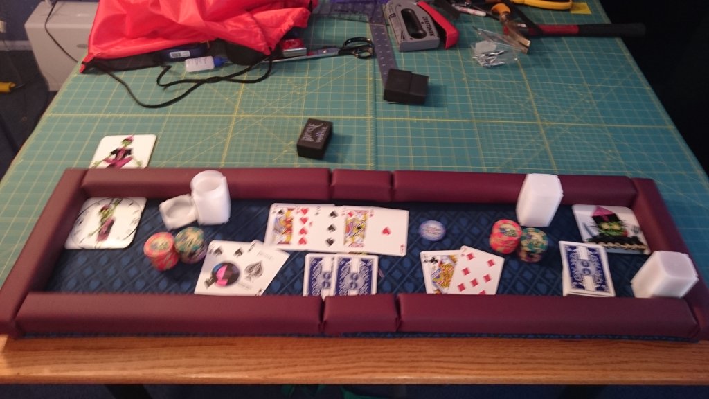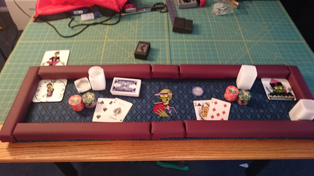 The mantra for the day was "well, it's not a Chanman quality table", as trying to develop something that would transform from a briefcase into a poker table ran into numerous logistical hurdles. In the end, we decided to stuff the whole thing into a sight fitting sack and ditched the briefcase idea, but the option to make it a single case is still viable.