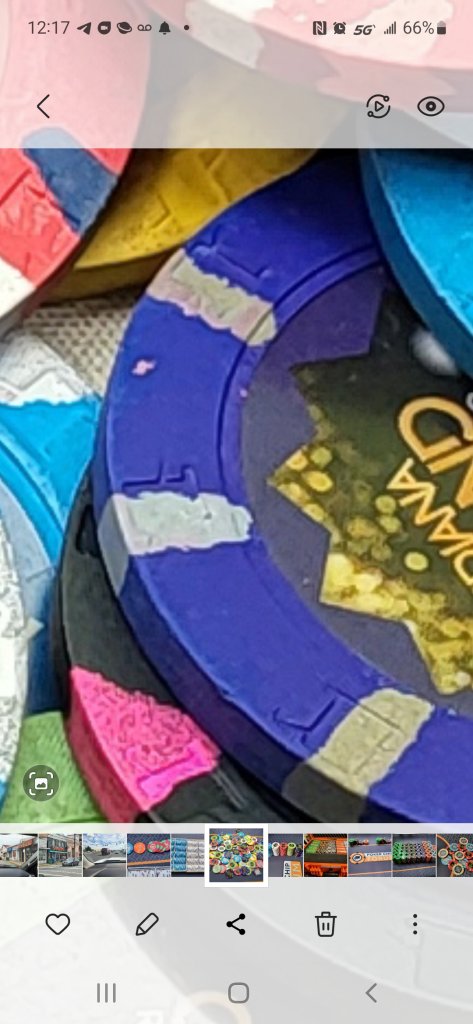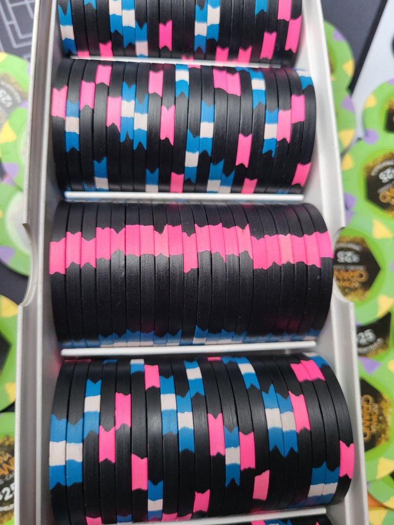 But in used/cleaned chips, which I have a few racks of, and have inspected up close -- some of the purple spots have faded to an almost light blue color. IIRC, on some chips, the color of the rolling edge is more faded than the same spot on the face of the chip. And on some chips, sometimes all the spots have faded, sometimes it's just a couple of spots that have faded.