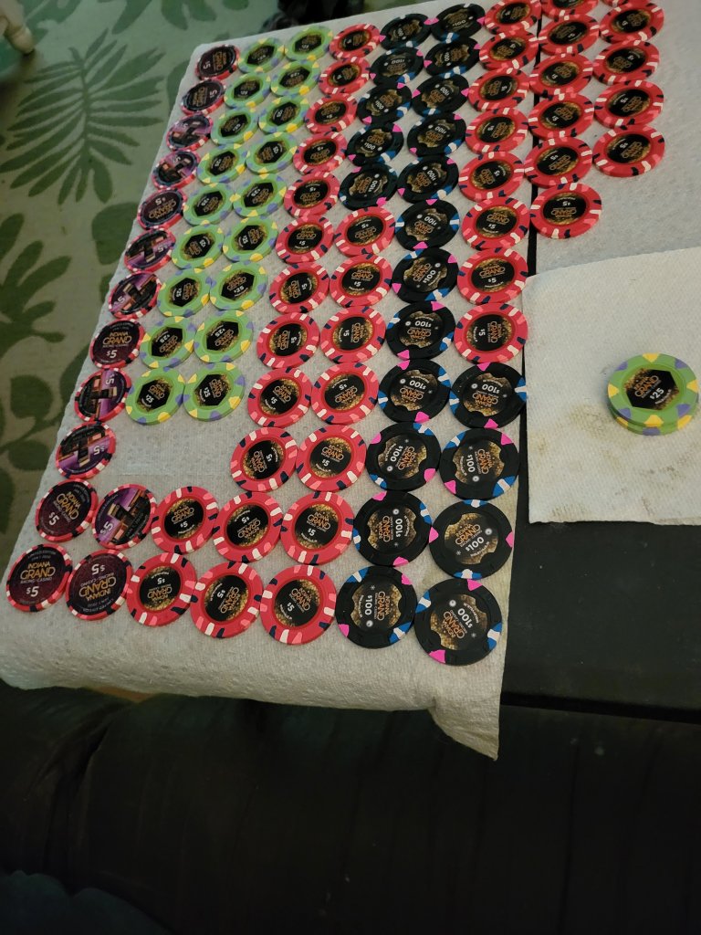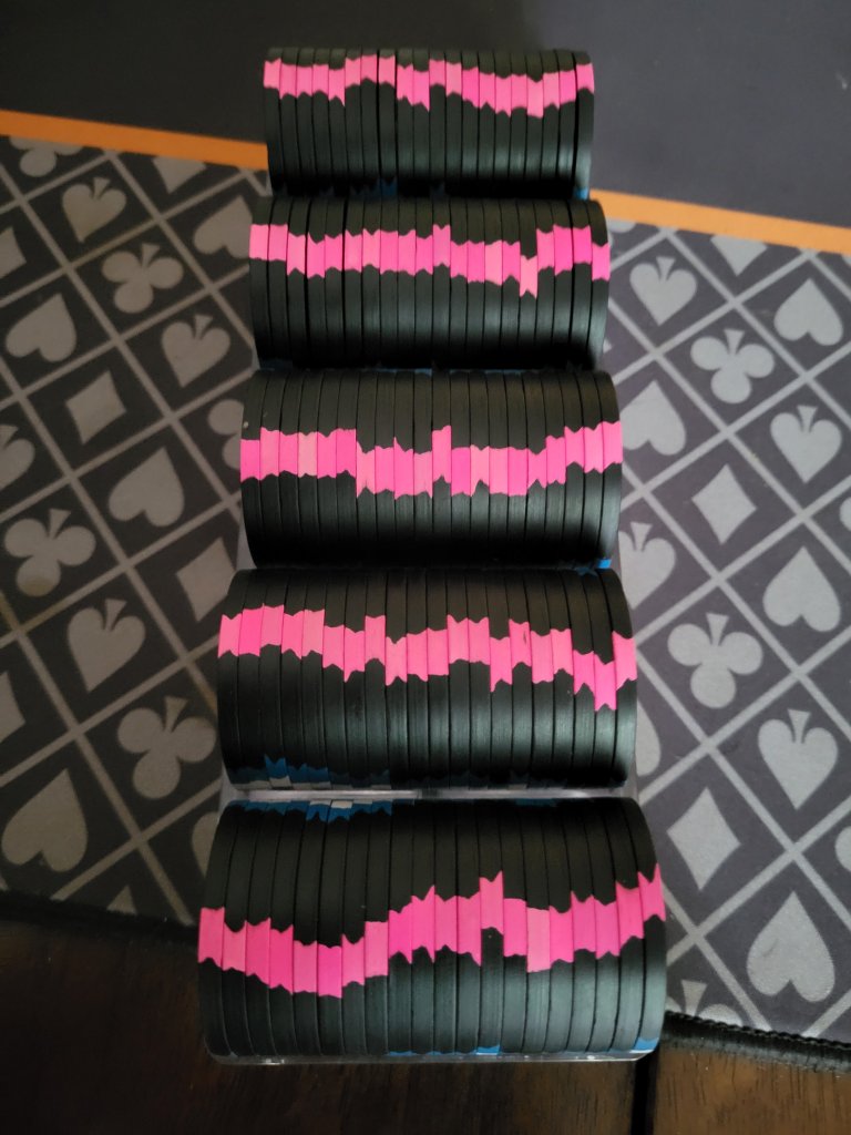 Finally got my IG set up. I got lucky on the primary $1‘s… Mint :cool (1 rack is a bit dirty), but didn‘t get so lucky on the bearclaw 5‘s, they are slightly used. Now all I‘m missing is 2 barrels of 500‘s. Thinking of getting rid of the primary 5‘s for the 500‘s, but I do kind of like the feel of used chips in a game. They shuffel easier and slide a bit better. Should I put a used set together:unsure:. I was telling myself that this was the last set I‘m buying. For our home game 300 chips are more than enough. (5-6 people), and we already have a nice HSC set. My girl asked me why I bought these chips, … and all I could do was raise my shoulders and walk away:wtf:. They just don‘t understand:rolleyes::ROFL: :ROFLMAO: