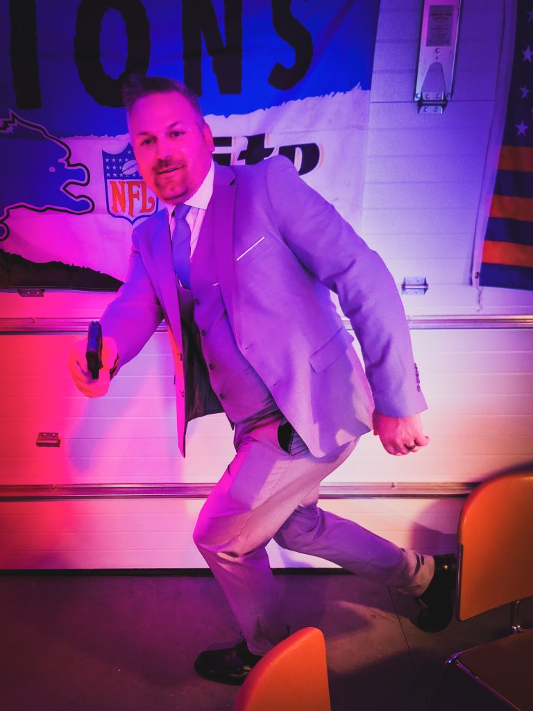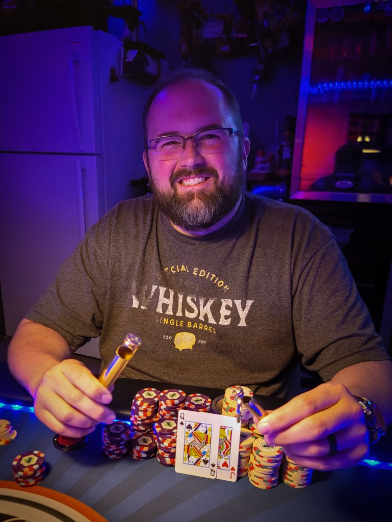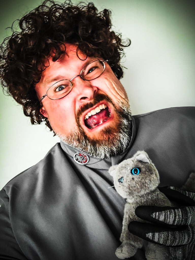 Myself as the very evil, Dr No Limit Holdem with Mister Butterscotch! Side note, the scars on my face were caused by Mister Butterscotch on the ride over to the tournament. We hit a pothole and he got startled.