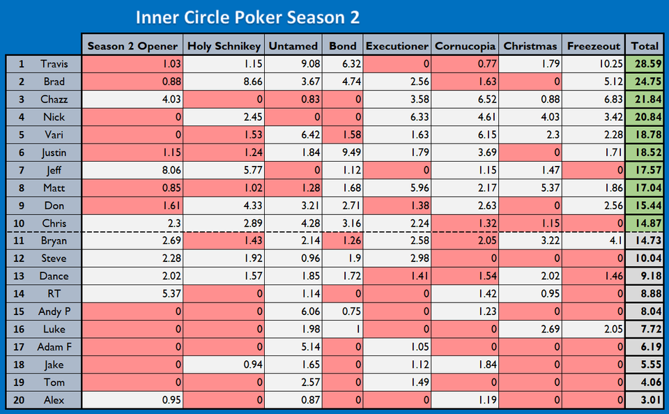 @TravNasty had already locked up first place for the season. With his first place finish, he will get his buy-in to our Main Event tournament covered. Second and third place were still within reach for a lot of players if they finished well enough in this "Last Chance" Tournament. Also, only the top 10 players of the season will qualify for the M.E. tournament. So there was a ton on the line for a lot of players in this tournament.