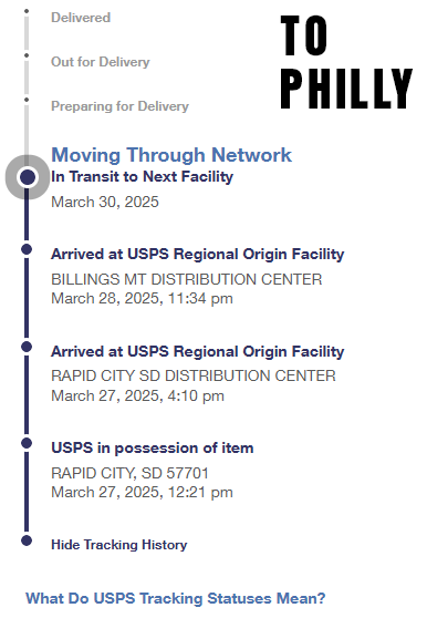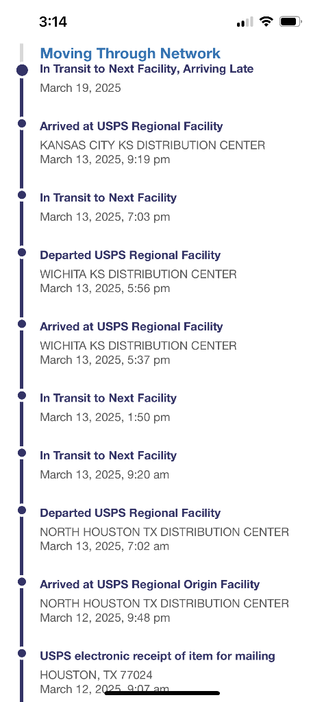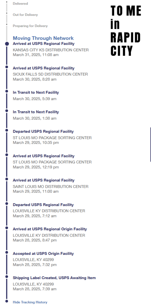My current nightmare with them. 2 racks sent from Texas on 3/12/25 to Missouri, may 3-5 days typically. 19 days later this package has been sitting|stuck in the USPS black hole known as the Kansas City MO distribution center. Hopeful this resurfaces back on the grid in the next week or so.