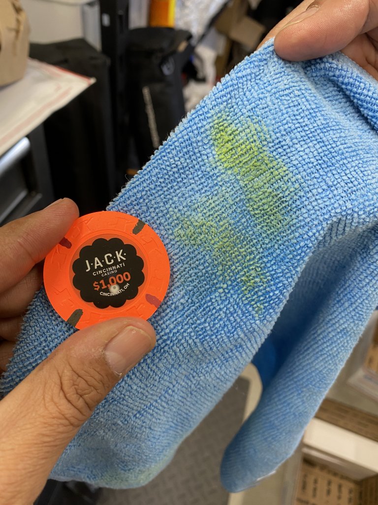 Opened up the shipment along with my good friend @Ocharacato only to see yellow lines in the cover of the box holding the 1K Secondary. He dabbed the microfiber with a little bit of oil, gave it a wipe, and there it was front and center. The amount of yellow that came off the chip in the pic below was only after one wipe. That’s not a full blown cleaning. There’s probably plenty more. Wiped down a Used Primary 1K, it’s also present on that chip.