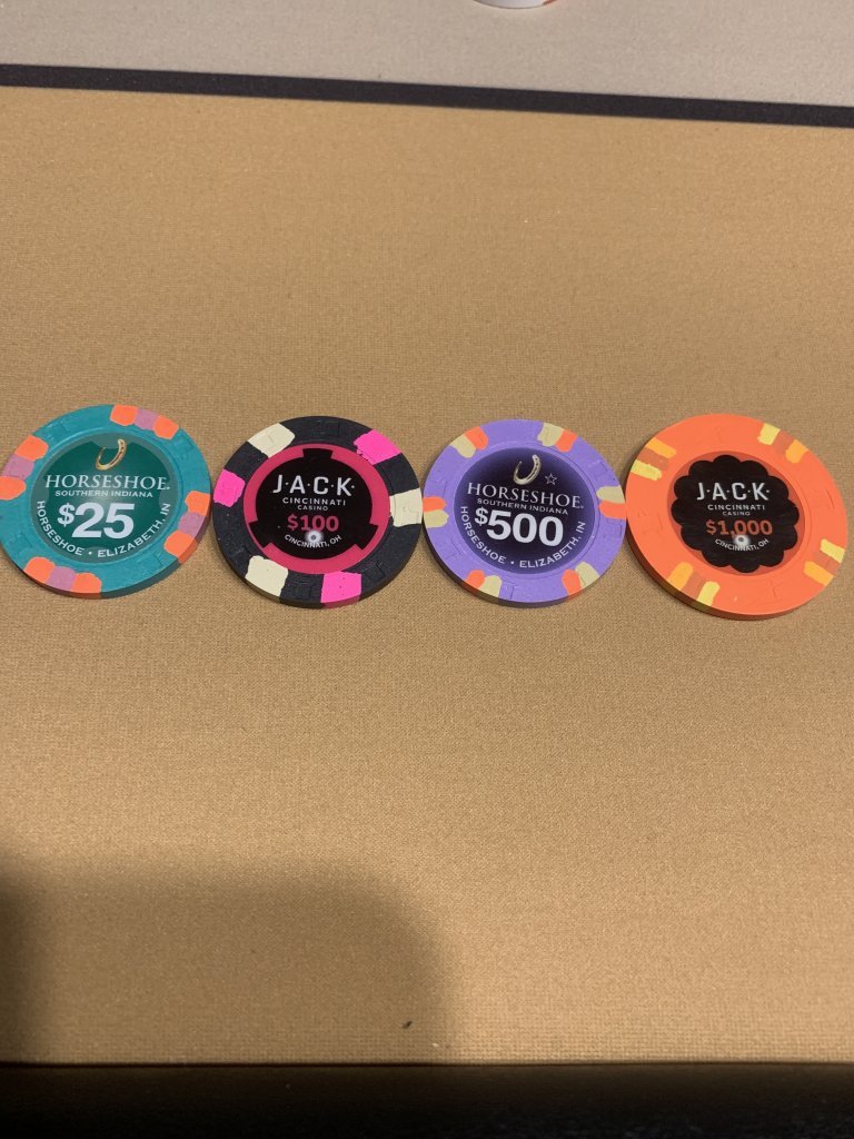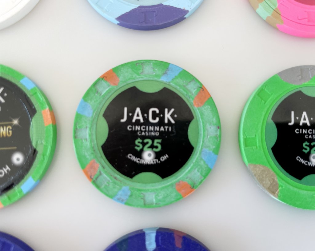I am kind of torn on this sale. The opportunity to mix some Jack Cincys in with my existing Jack tourney and cash sets is tempting; I could replace a few over labeled denoms with originals. I really like the $2 chip, but already have enough of those from a harvester, and love the snapper. But I’d have to be putting together a mixed spotted THC set to justify it, or overlabel/inlay replace it, so that seems pointless. The new 25s are tempting as well; one of my sets has overlabeled 25s because I didn’t care for the JD watermelons, and I could swap those for the Cincys. I have enough 1Ks and 5Ks for my tourney set, and neither 25K really moves me. Plus I only really want new chips, and Jim has indicated that those are in short supply.