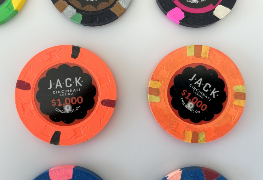 Wow. I didn’t even notice that green spot. I compared the two $500 chips for a few seconds, to see if they were the same base color. And I never noticed those green spots.