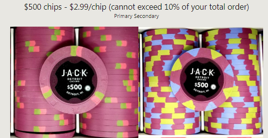 @TheChipRoom, I'd like to try my hand at a small order of these chips, but I might have missed a clarification. Is it okay to mix the primary and secondary chips of denoms $25 through $5000 as long as the total of each denom is within the % limit? For example, if I made a 400 chips order, I could order up to 20x 5000 (5% of total), but I'd like to split it as 10x primary and 10x secondary. Is this allowed?
