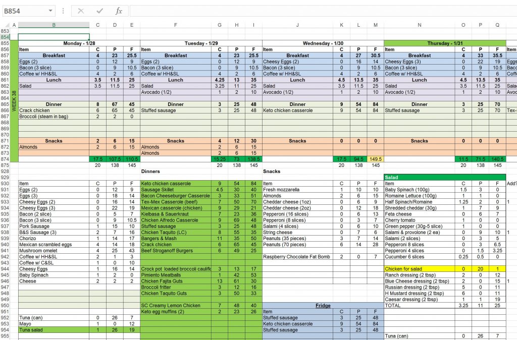 I tried a few different apps but I didn't care for them, they were OK for tracking purposes but not for planning, which I think is more important. I have a couple that I kept for looking up macros for new foods. I'm an engineer, so spreadsheets are way more my thing :) - I use a pretty simple one to track my daily macros (carbs/proteins/fats). It's got my weekly plan with targets for each macro and a big library of things I typically eat.