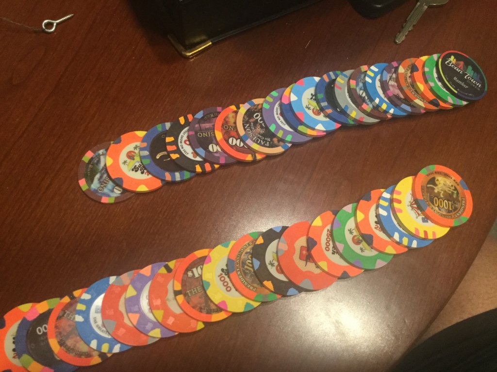 Your hint "Everything you need to win is in front of you" made me realize that all the chips had probably been mentioned already, and in the end I decided that there had to be both Ritz 1ks and ambassador plaza 1ks mixed in. And you're right, looking closely it was actually a pretty different yellow on one of them, which made it pretty clear.
