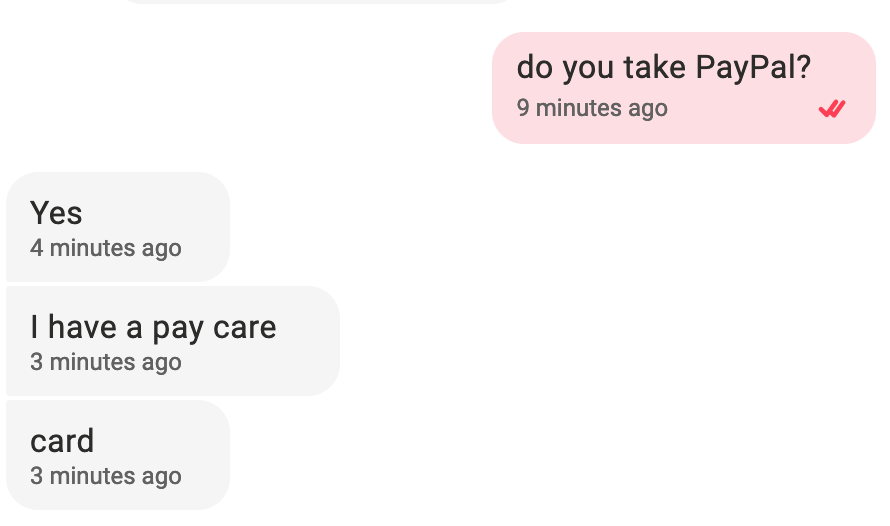 I frantically start looking for people I might know in the area. My girlfriend's ex-boyfriend's family is there and after a weird mix of texts and calls they agree to have the seller deliver the chips there but I'd have to pay for it somehow. The seller agrees to accept $100 via Western Union (which I have never done in my life), and after paying a $17 fee on a $100 transfer the money is sent.
