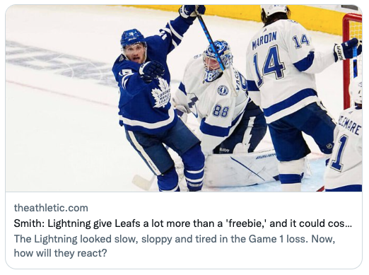 I haven't watched the Leafs closely this year, but I have seen a few games. Last night, their transition game was unbelievable...better than I've seen in the other games. I'm not sure they can sustain that level of execution. Plus, if there's a team that can re-group mentally, its a team that's won 8 straight post-season series. I wouldn't count the Bolts out yet.