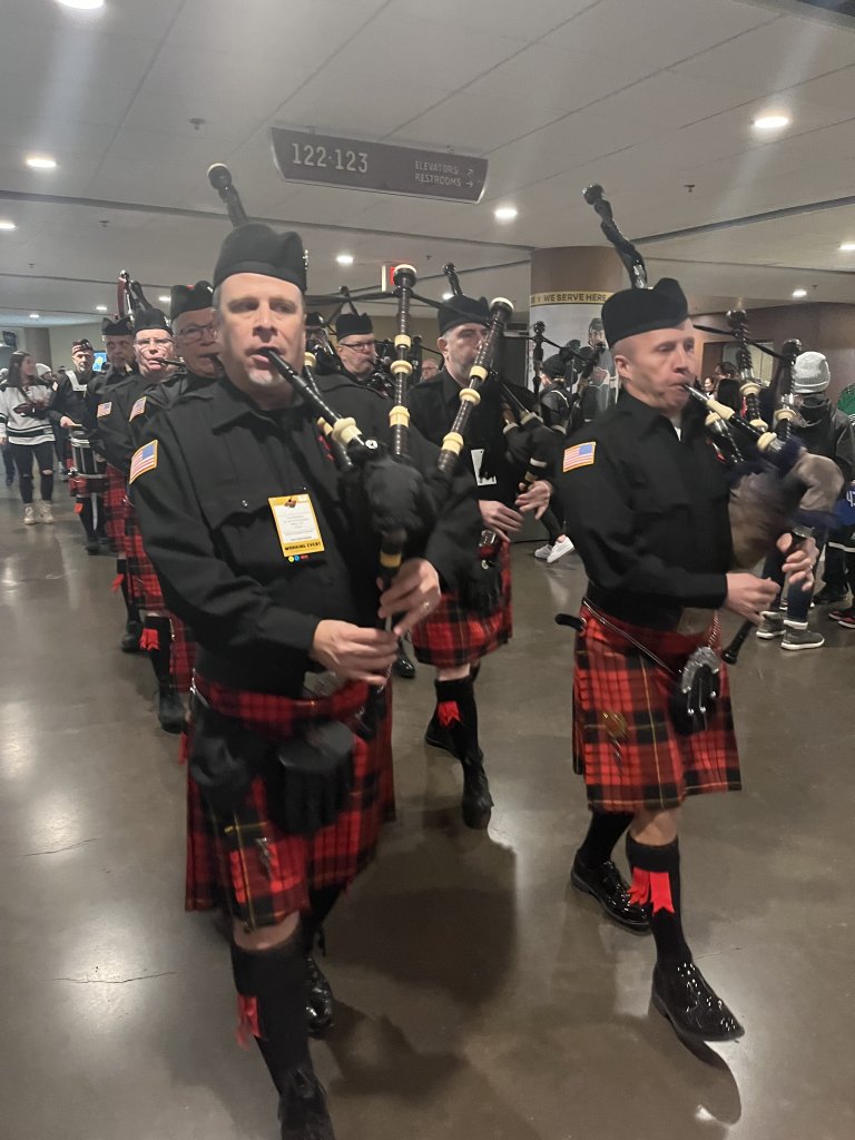 My favorite part: The bagpipers are wearing credentials. I'm pretty sure that if you are wearing a kilt and carrying bagpipes at a hockey game, they know exactly where you should be.