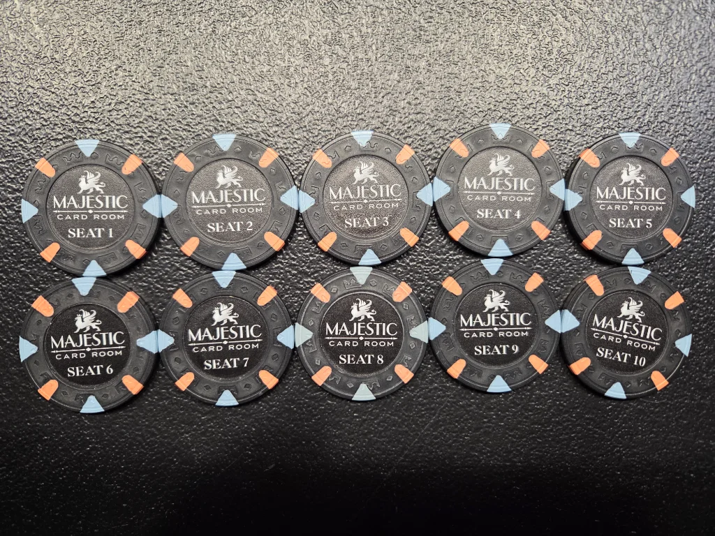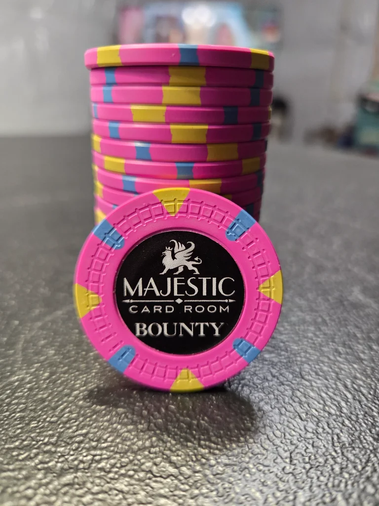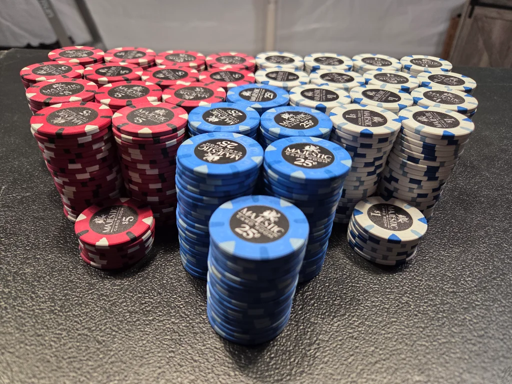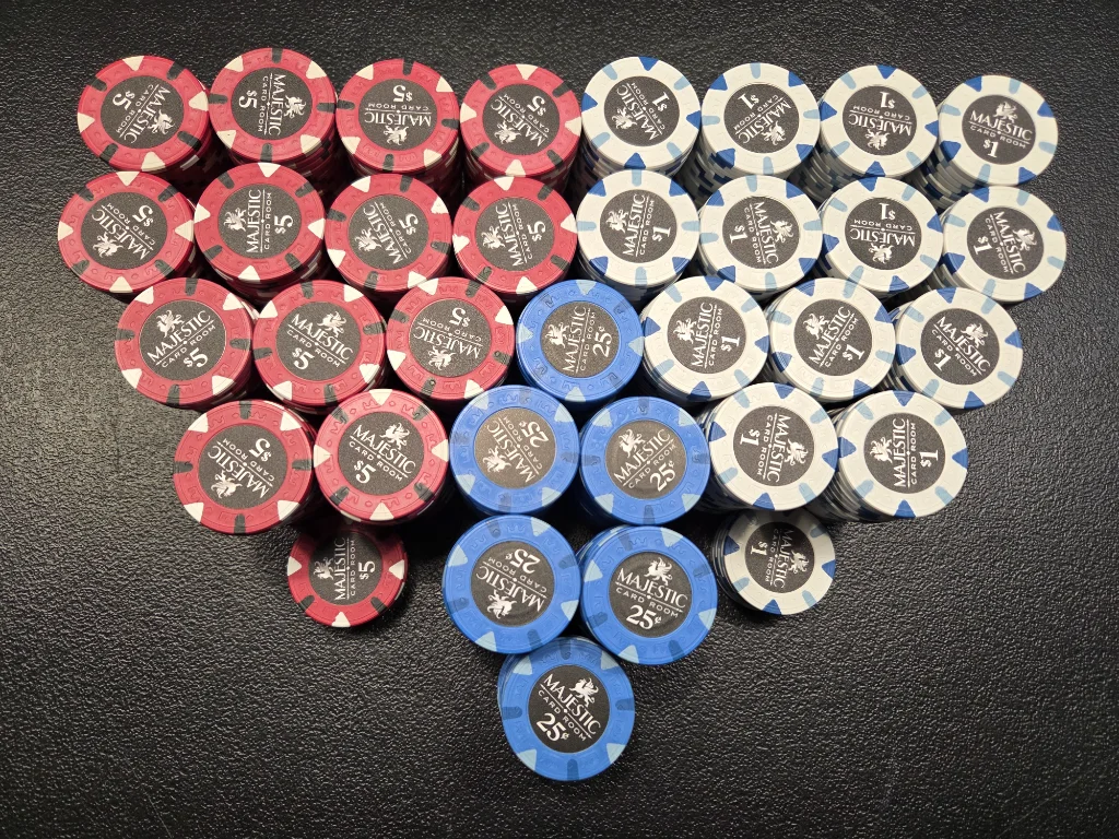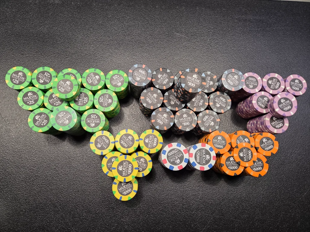 If my counting was correct, I have 1633 total chips ranging from 25¢ to $25,000. Also included in this figure are four sets of custom seating chips (seats 1-10) in blue, white, red and black chips respectively, as well as 25 custom Bounty chips.