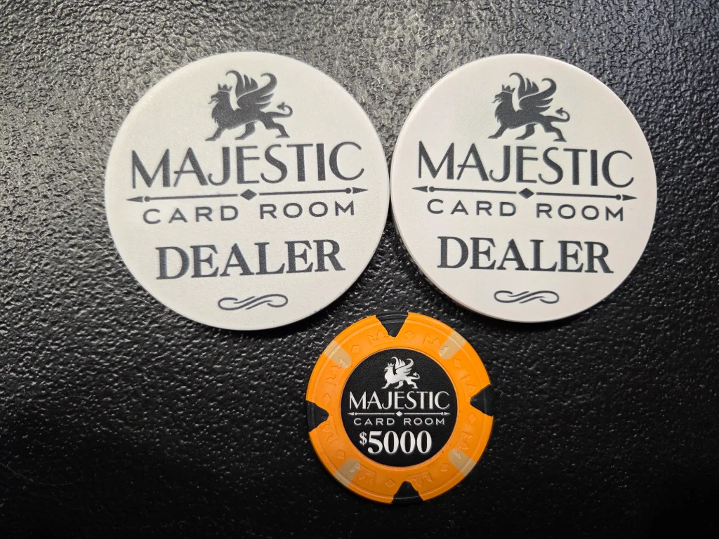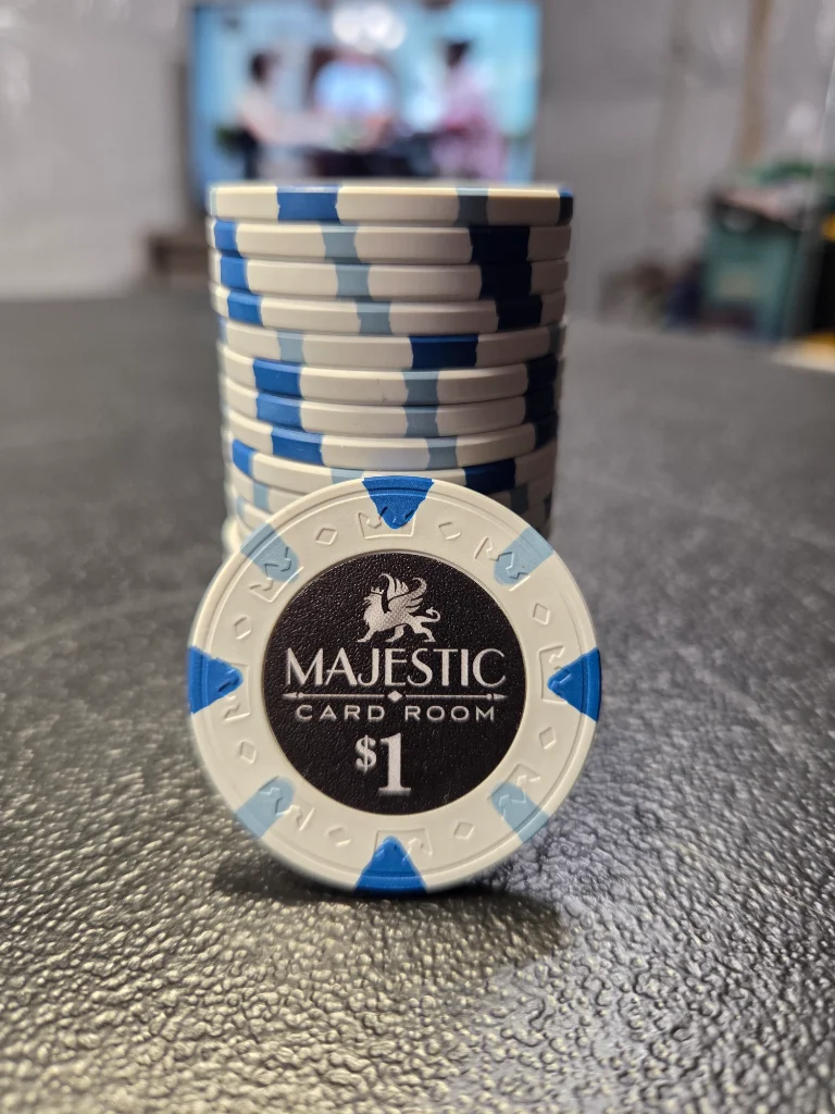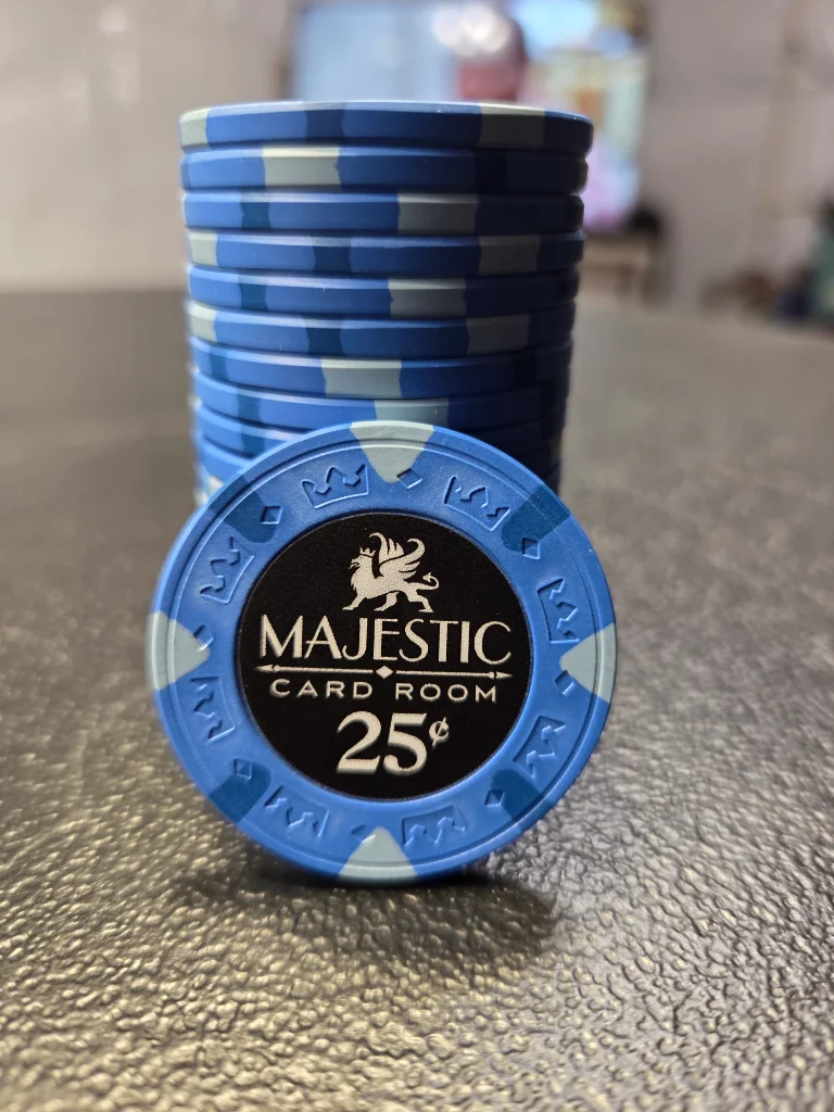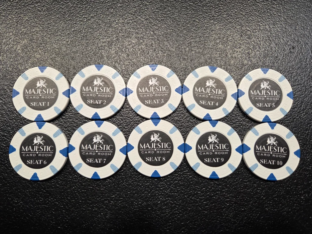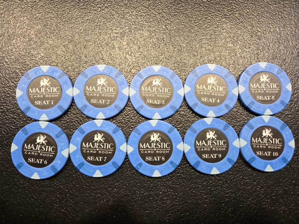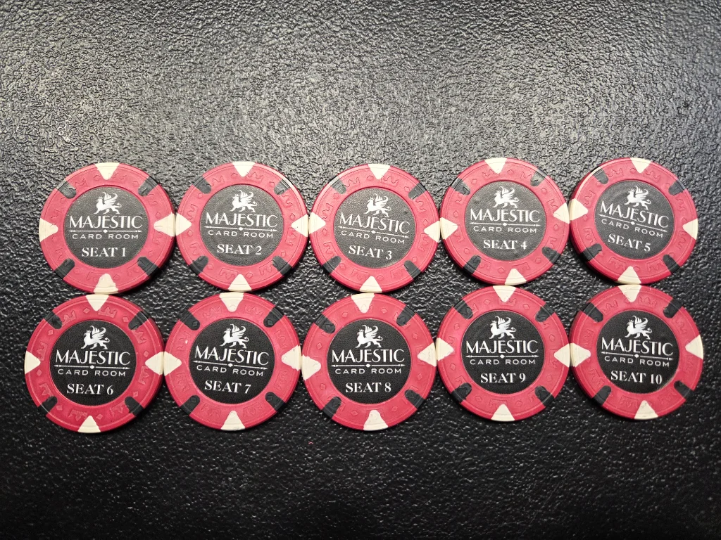 If my counting was correct, I have 1633 total chips ranging from 25¢ to $25,000. Also included in this figure are four sets of custom seating chips (seats 1-10) in blue, white, red and black chips respectively, as well as 25 custom Bounty chips.