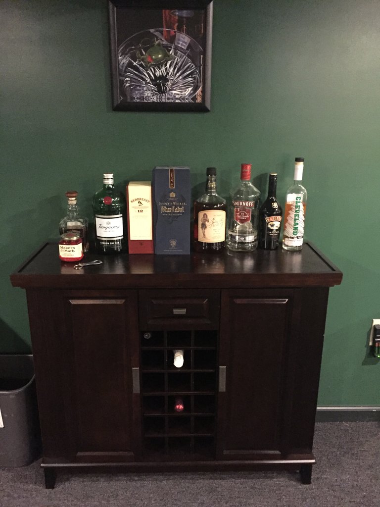 I am in the middle stage of putting together my man cave and would like some input from you vets. The basement is completely furnished and I nearly done hanging all the pictures etc. What I don't have yet is any type of bar. The room is just a big rectangle with no plumbing so I was planning to keep it simple and maybe just get a beer fridge. Any thoughts on drinks setup?