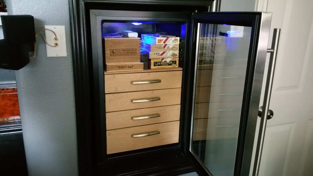 Cigar humidor - if you want quality don't buy off the Internet. Most off of that is junk with terrible seals, you'd be fighting the humidity all year round. I'd highly recommend either an off the shelf humidor from Savoy (Desktop or Executive) and stay away from glass tops - they leak like crazy. A custom option would be from Waxing Moon Humidors. Expensive, but worth every penny. I hope to have one of my own one day. Also - a wine fridge converted will hold many more, see my pics in this thread!