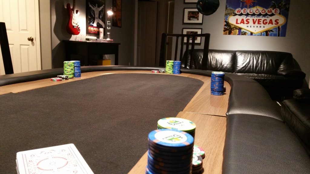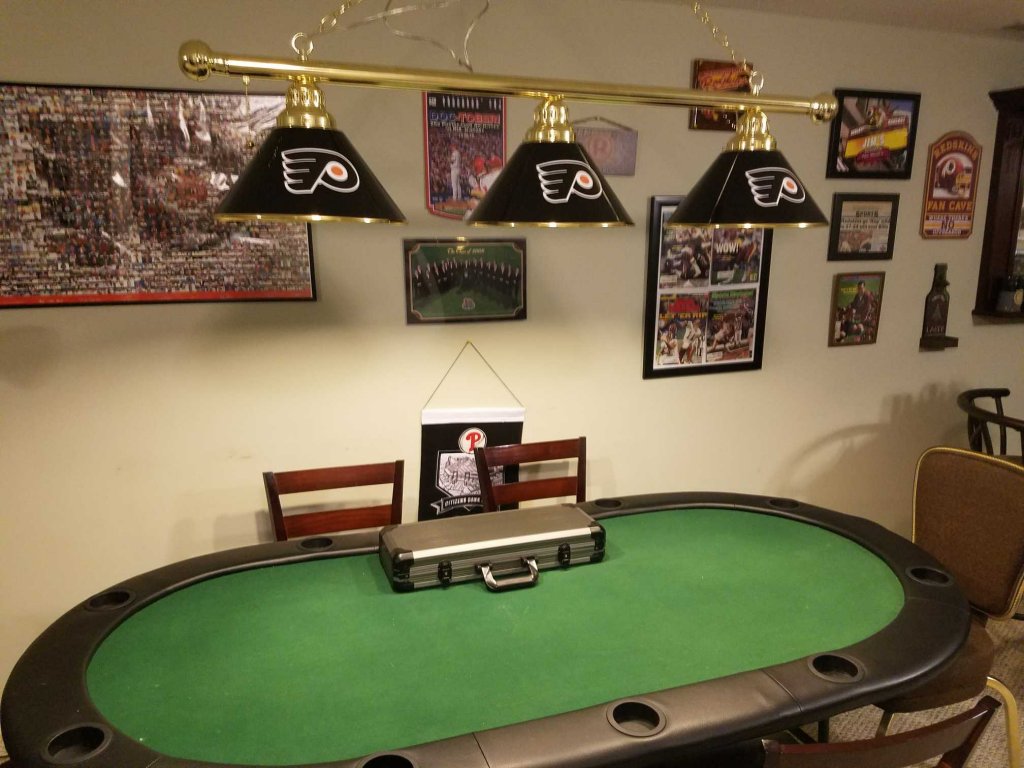 Here is a pic of my more or less complete poker man cave setup. I am happy with everything right now except for the table topper. Really disappointed with that purchase. I wasted 150 on what is a fugly topper. Anyway I have already paid a deposit on a basic table from Chanman that looks exactly like Rhodeman's.