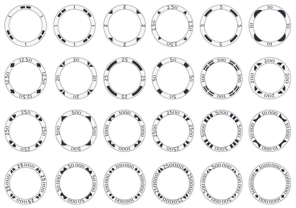 The denoms will be (at least) 1k, 5k, 25k and 100k. In the mock-up I just substituted 25k with 10k, because Matsui's design tool is missing the 25k with the flourishes between the denoms. Below are all the inner ring options (with flourish, no currency symbol) for reference. My thought was to avoid duplicating or even nearly duplicating a flourish shape. For example 5 and 25 would be too close.