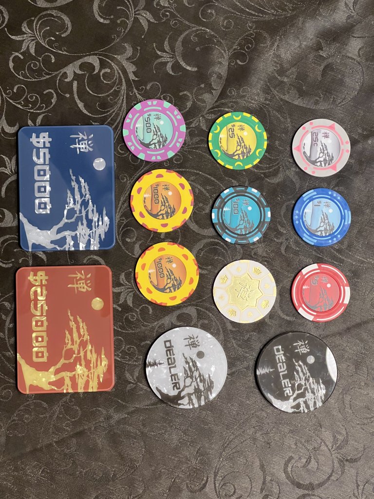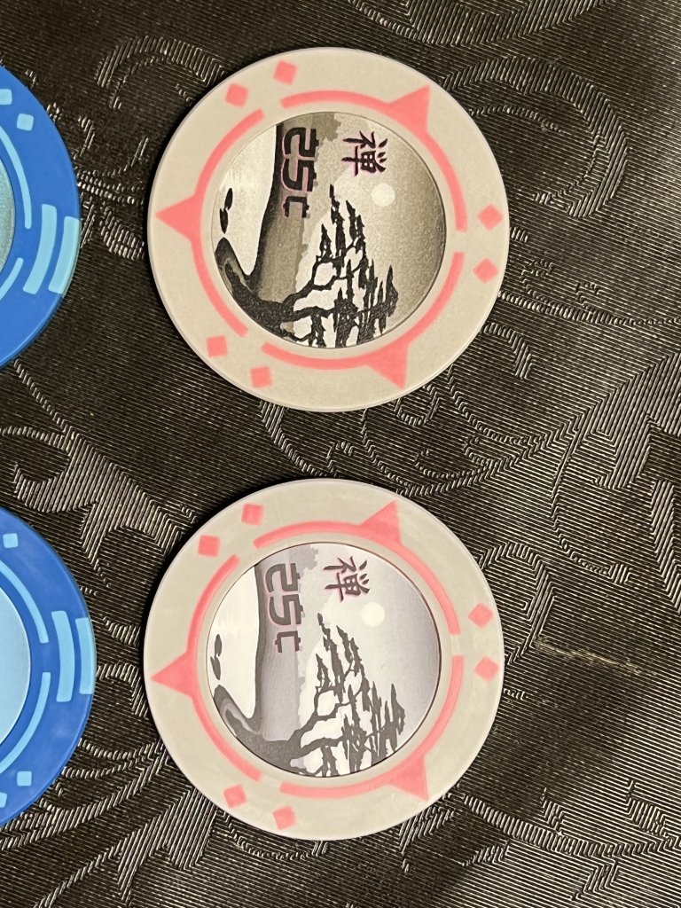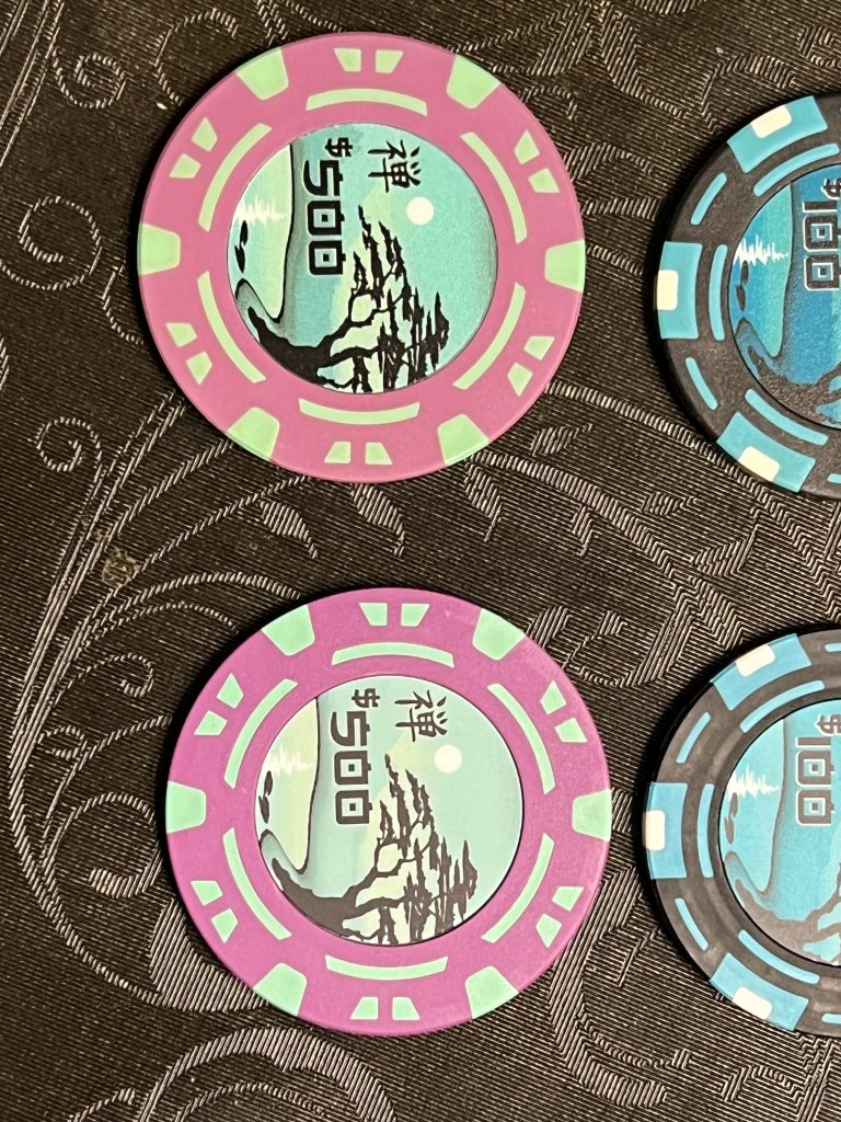 So I got some close up shots here, the side by side are old zen vs new(old left new right) for the denominations I have on hand. The older chips are a bit different, the plastic has dulled and the inlay has darkened or maybe the colors are slightly different now