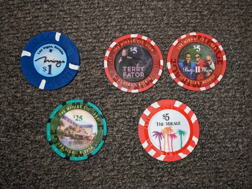 Was the basic $1 and $5 new?I was in Vegas over the weekend, stopped off at the Mirage for blackjack, and I was SO excited to discover some brand new chips! Love the $25 tribute. If I wasn't with the wife I would have tried to harvest more, but I left with full pockets![]()