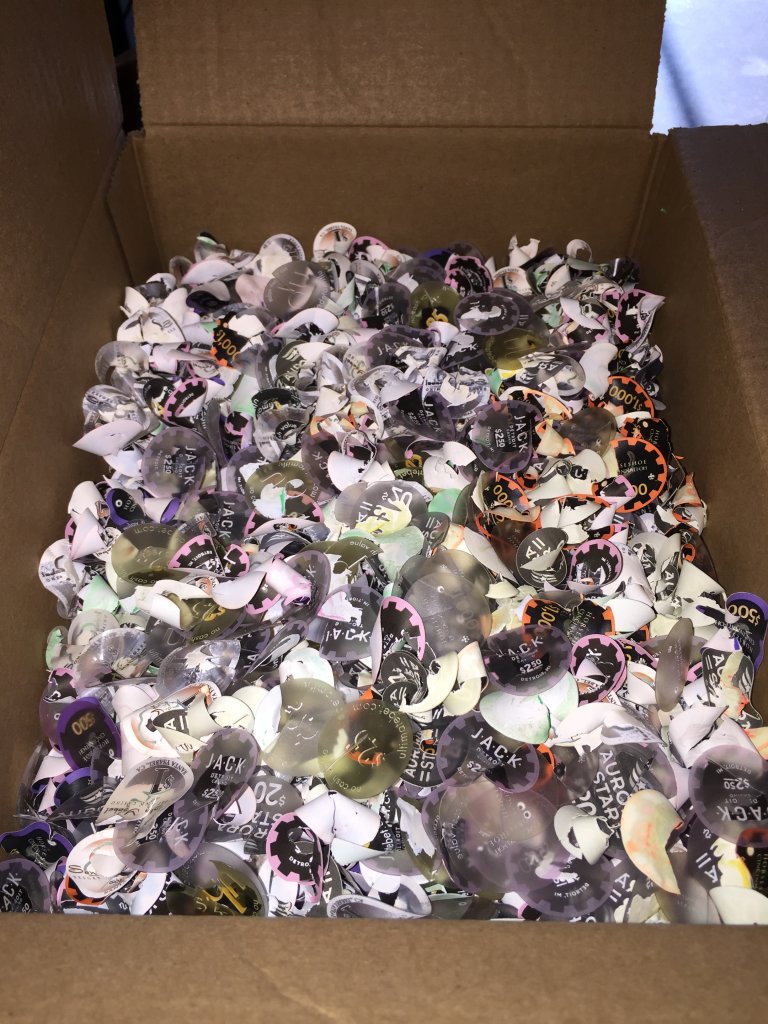 I’ll have 4800 (2400 chips) to show soon.I'm glad I'm not the only chipper degenerate enough to keep their completely useless and torn up/destroyed labels. I only have 300 of them though, not big league enough for a whole graveyard.... yet.