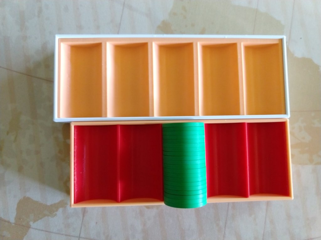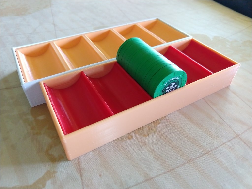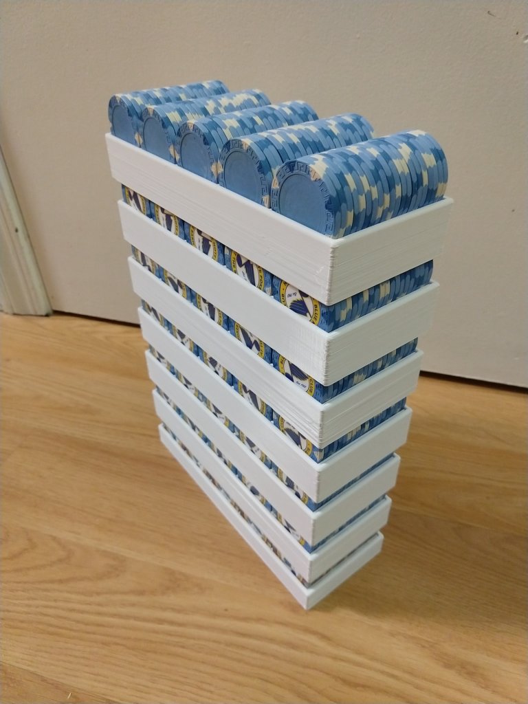 I've been printing racks for my 1200 chip 8V limit set and refining the rack design as I go. The bottom rack is flat on the bottom. I'll have a layer of those on the bottom of an Apache case, then 6 regular racks stacked on top. I'll be sharing the model soon, and I'll put the 71mm racks for the 8V China Clays in my store first. Then I'll move on to racks of other sizes.
