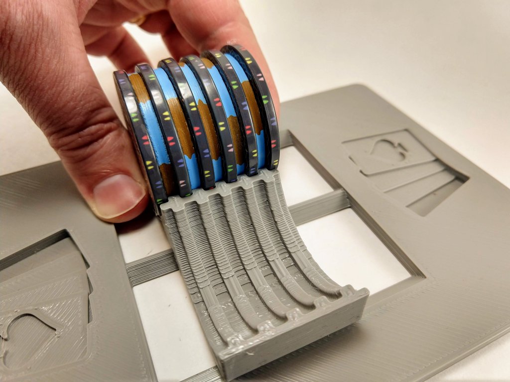 @AK Chip requested a "ribbed" version of the 43mm insert for the chip flattening rack so that 39mm chips would be centered the same as the 43mm blanks and not all to one side. Here is my mock-up print. Excuse the quick and rough print quality, and imagine that the 43mm black Muertos chips are the blanks.