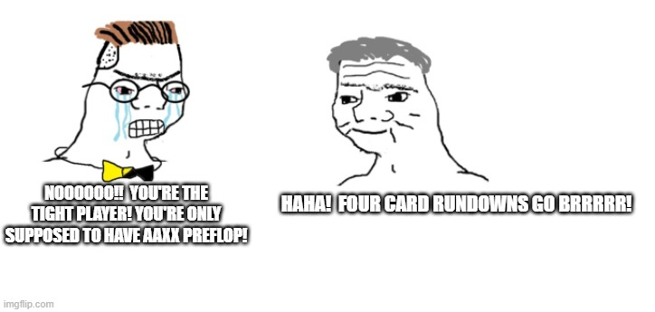 Lol, I have :ah::qh::5s::3s: on a flop of :kh::td::3h: and get it in against :ks::kc::qc::qs:
