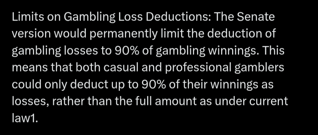 Watching Doug Polk today and heard about the "Big Beautiful Bill" that was just passed. Gamblers can no longer write off 100% of their losses against their winnings, rather just 90%.