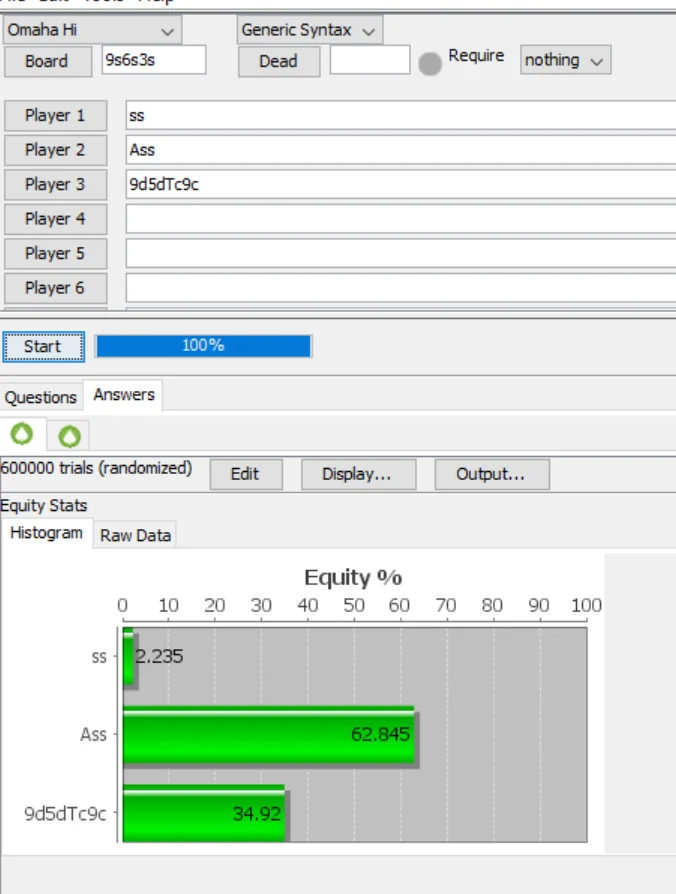 Yay, you got half and my range wasn't ass. You were the (slight) favorite to scoop though. Also do the math against (all) ranges not hands, but I assume you're only doing the result for the video. I would also suggest https://plomastermind.com/plo-equity-calculator/ (remember to go to settings and select double board) to get your EQ but I'm more interested in their range, are there hands that kill you, are there hands you dominate, etc. For this specific holding: