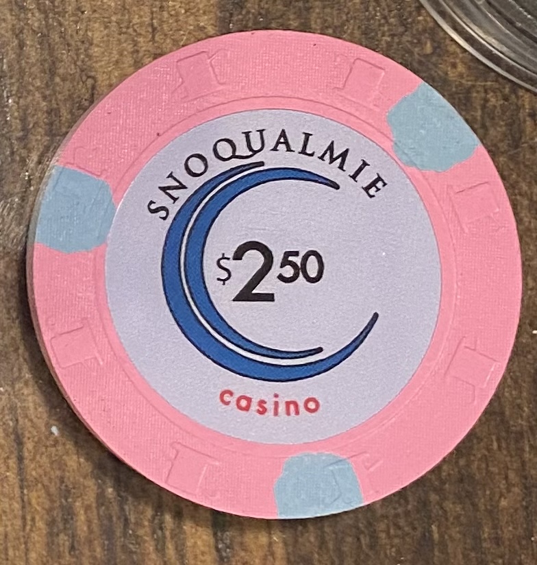 Snoqualmie Casino is swapping out their old rack of Bud Jones with Paulsons... one denomination at a time. As of 8/28 the only chips that have been shown are the $2.50,$1K and $5K. The $1K and $5K are already out because they are new denominations to this place. The snapper is RHC and the $1K and $5K are 43mm IHCs. The $1K is Blaze orange chip with a 4V418 pattern.