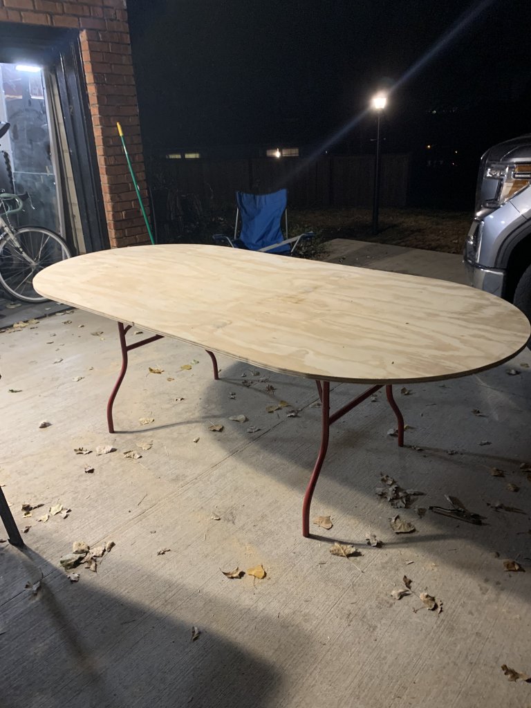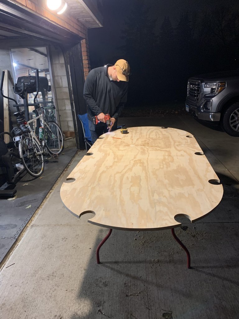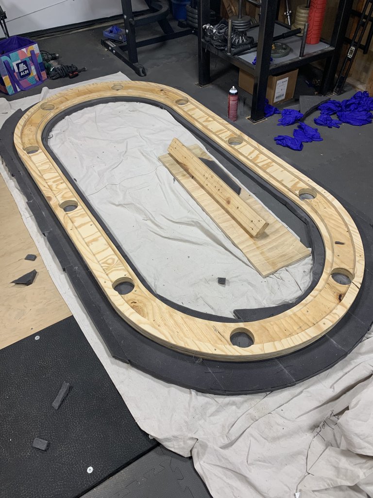 Just started a new oval with another member. 10 seater with 3 on each side and 2 on each end. Plan is for red Monaco speed cloth with a betting line, in-rail drink holders, continuous tucked LED illumination with dimmer, and USB ports. Pics as available. Also tossed up our two octagons that he and I put together this last summer/fall.
