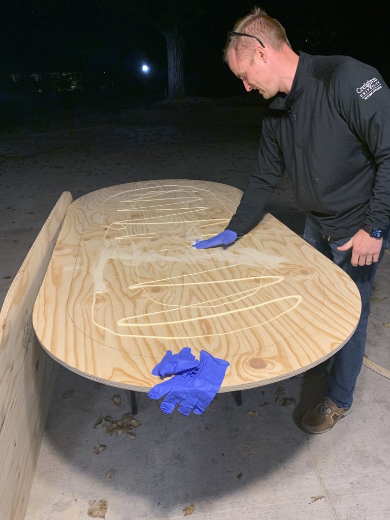 We have the wishbone folding legs set at the arc and attached to a piece of 3/4” plywood, the remains of the 4x8’ sheet we cut the 6” rail and rail lip out of. That leg piece is screwed/glued to the 3/4” piece of plywood which we cut to create the playing surface.