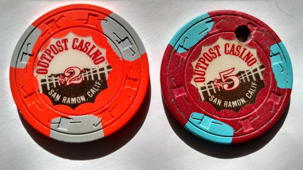 i just looked thru 1000 chips since i thought i had an Outpost chip where the inlay way was almost out to the edge, could not find it but i only have 22 of the $2 chips and 5 of them the inlays are off, plus look at the edge spots where something wasnt going right.. found this other Outpost with a gunshot hole, must have been rough at the paulson factory that day..;)