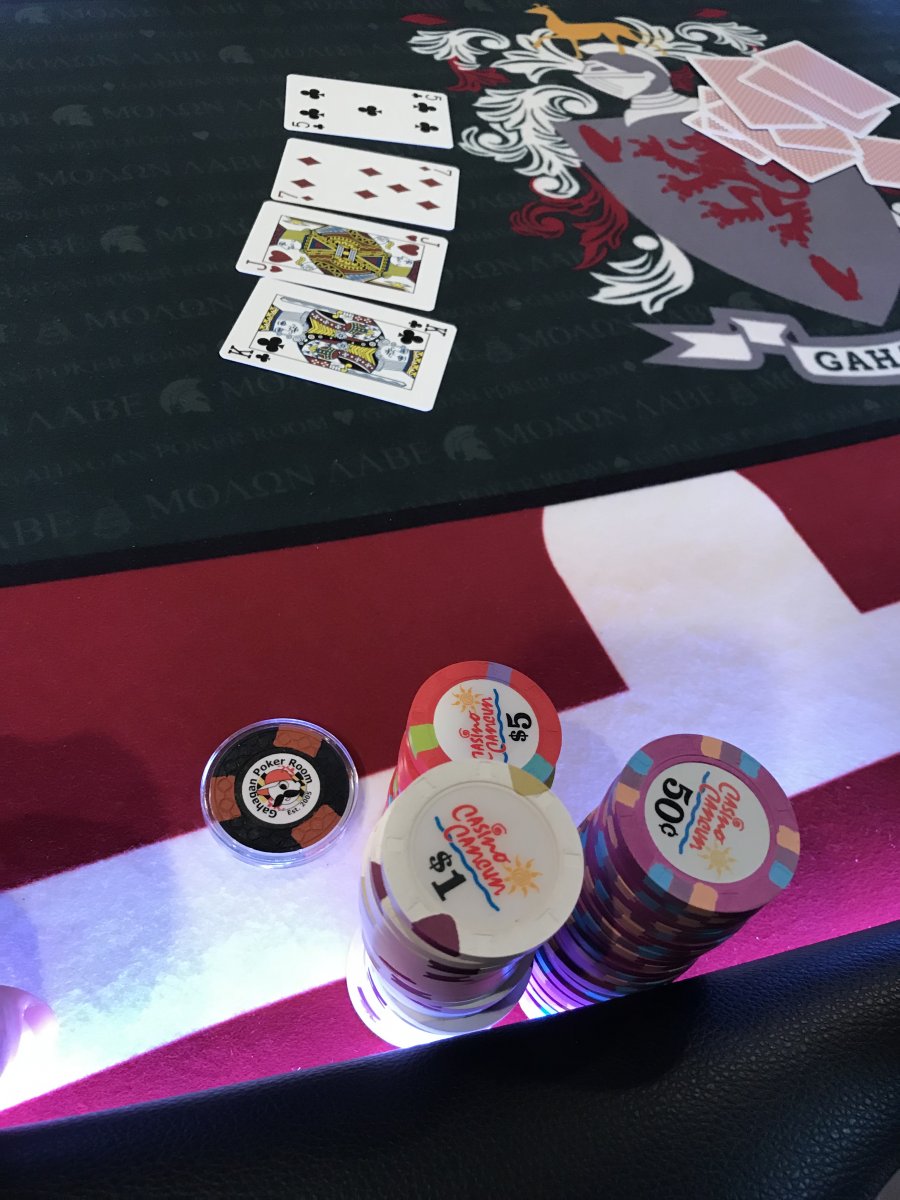 Now if I had 77 on the flop I would have bet $50 to protect from exactly this type of run out.
