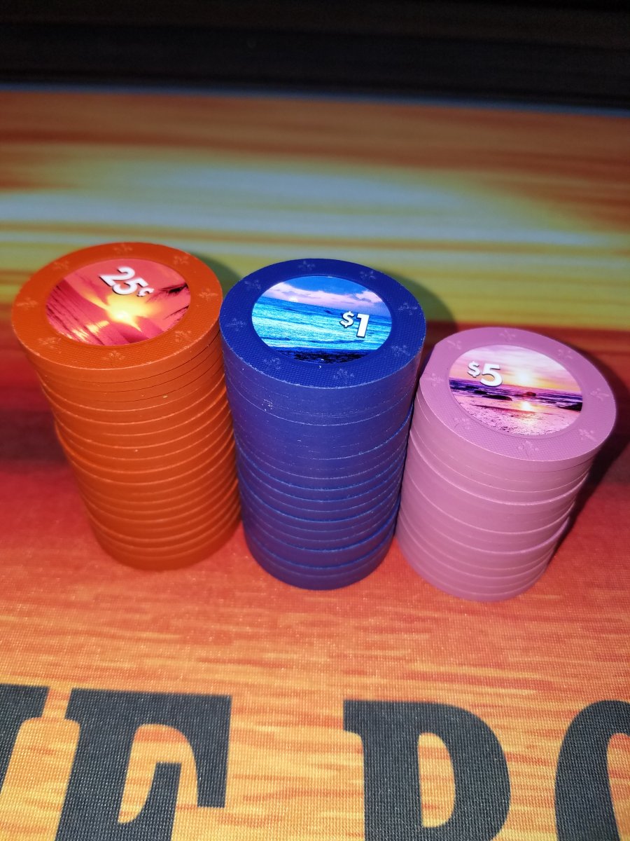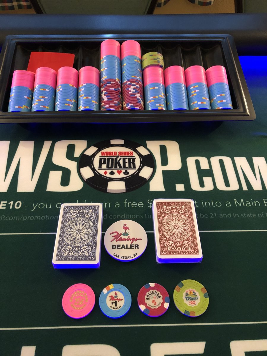 Chip menu is a mixed set consisting of 25¢ Railroad Pass, $1 Flamingo spotted birds, old school $5 Hacienda and $20 Dunes chips