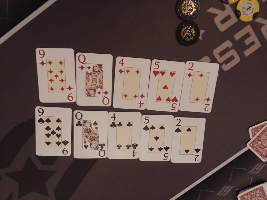 Here's a shot of a hand using Rule 37 (Deal burn cards face up, board cards face down. Players make the best hand using the three burn cards, instead of the five board cards).