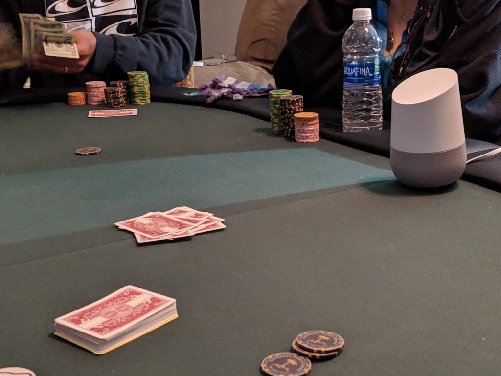 In this next shot, you may notice a Google Home sitting on the table. One of our players also maintains our league web site, and he implemented an app on the site and a corresponding Google Action that selects a random rule for each hand. It will also select random numbers for rules that require dice rolls. It was faster and easier than dice and printed rule sheets, and it really kept the game moving.