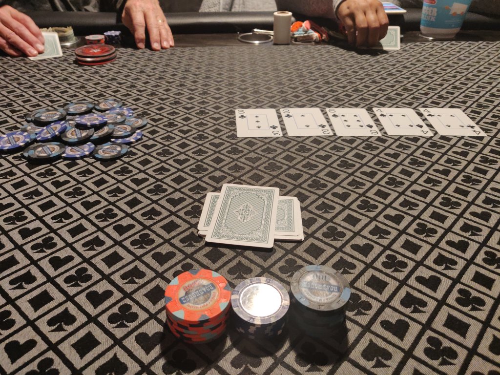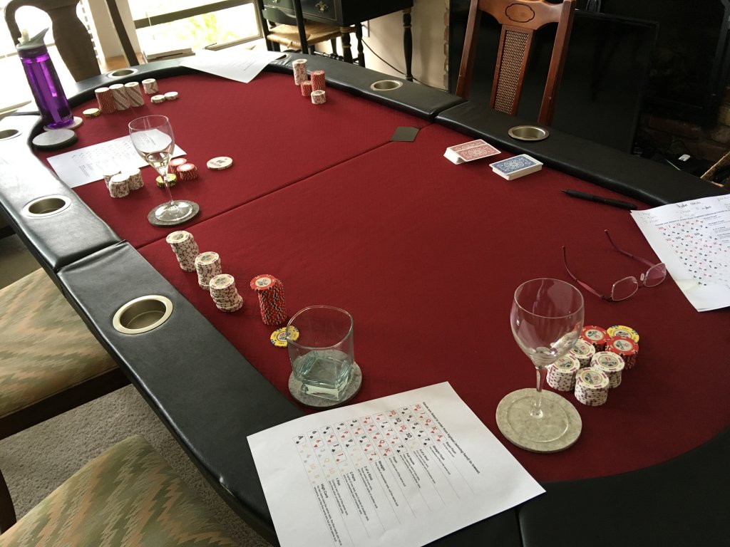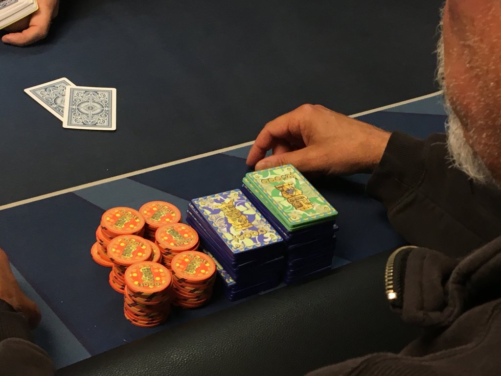 Current stack roughly 50k, playing 3-Ring Circus tournament (alternating levels of pot-limit Double-Board Big-O Hi/Lo, 5-card Two-Hand Hold'em Hi/Lo, 5-card Scarney, and Dramaha (2-card draw). Down to five players, pays two. Blinds just went up to 800/1600.